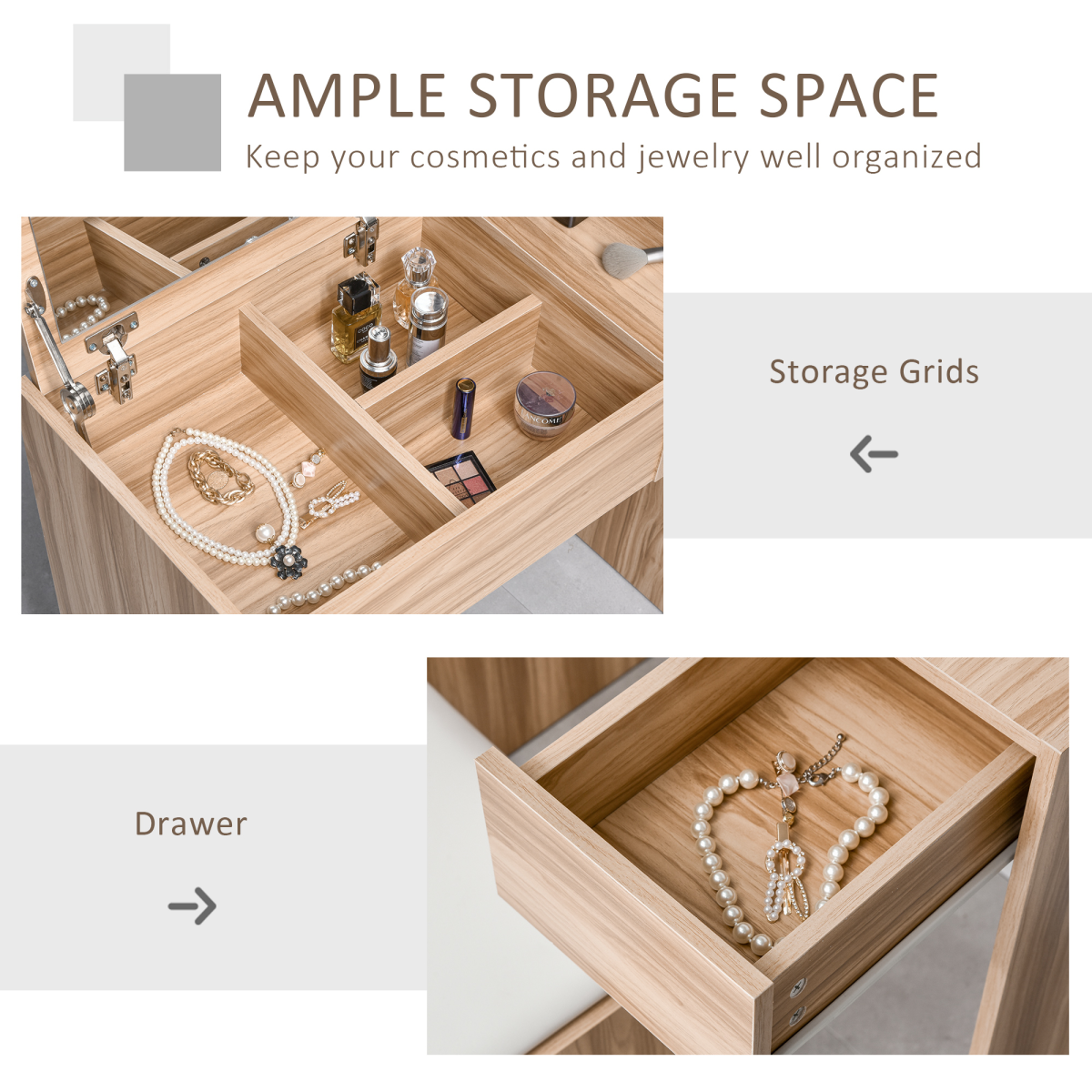 Flip-up mirror can be set to a 90-degree position for convenient making up and dressing Hidden space under the lid and a slide-out drawer offer ample organised storage Easy to convert from a chic dressing table to an ideal writing desk with the flip-up design Padded stool with smooth leather and soft sponge offers optimal comfort E1 chipboard is eco-friendly with easy-to-clean veneer Heavy-duty construction ensures lasting durability Table & Stool supports weights up to 100 kg each