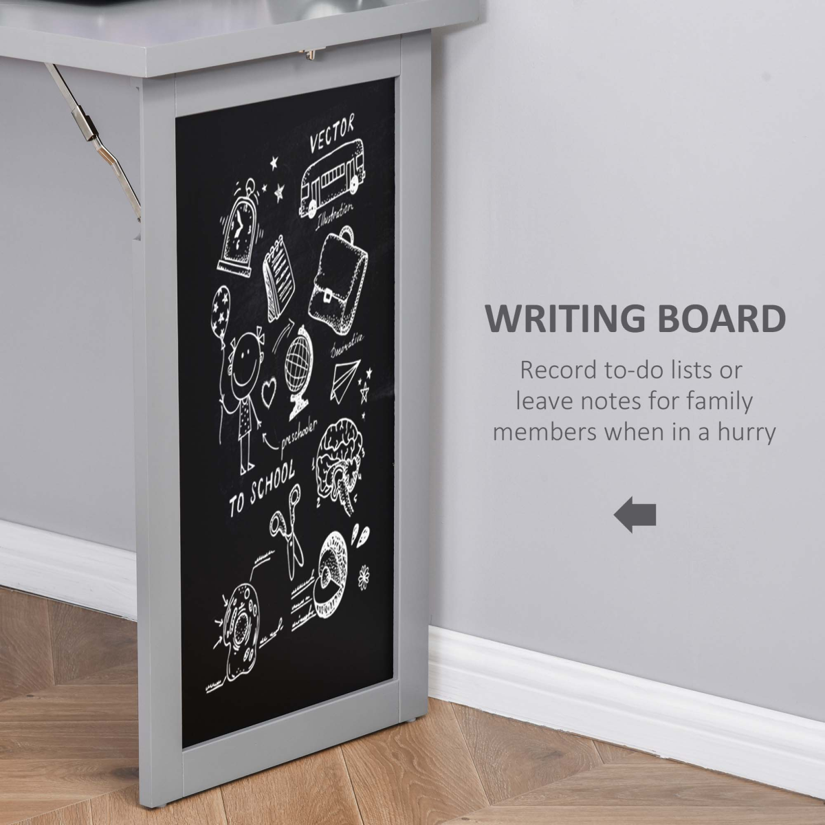 3-in-1 design: The home office desk is formed of the end bookcase, middle work table and the chalkboard on the end panel. A place to work from, where you can keep your books close and thoughts visibly noted. Shelf features nine compartments, bottom shelf can be moved to three different positions.Folding: Computer table can fold up into the bookcase and displays the chalkboard when correctly locked into place. An innovative design made to save space where needed.Sturdy: Tough and durable particle board structure made to be used every day. Fitted with metal hinges and accents to hold each part in place. Blackboard: Displays when the study desk is both folded and unfolded, easy to see your thoughts at all times.Anti-tipping: Fixes the study table to the wall for safety in homes with children and pets. Dimensions: 153H x 98W x 51Dcm. Middle table: 75H x 47.5W x 78.5Dcm.Maximum load: Whole: 60kg. Table: 50kg. Assembly required.