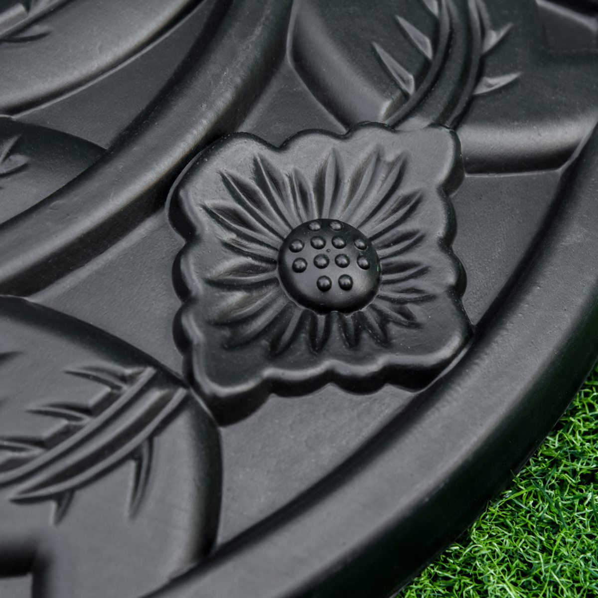 Description: "Incorporate elegance into your garden furniture with this half parasol umbrella base from Outsunny. Made from a blend of HDPE, cement, and metal, weighing 10kg, it can withstand heavy rain and wind conditions, making it suitable for use all year round. In a versatile black hue, it features a top engraved with a delicate and beautiful flower design and is finished with a tightening screw to hold the parasol pole securely in place all day long. It's the perfect combination of beauty and functionality."