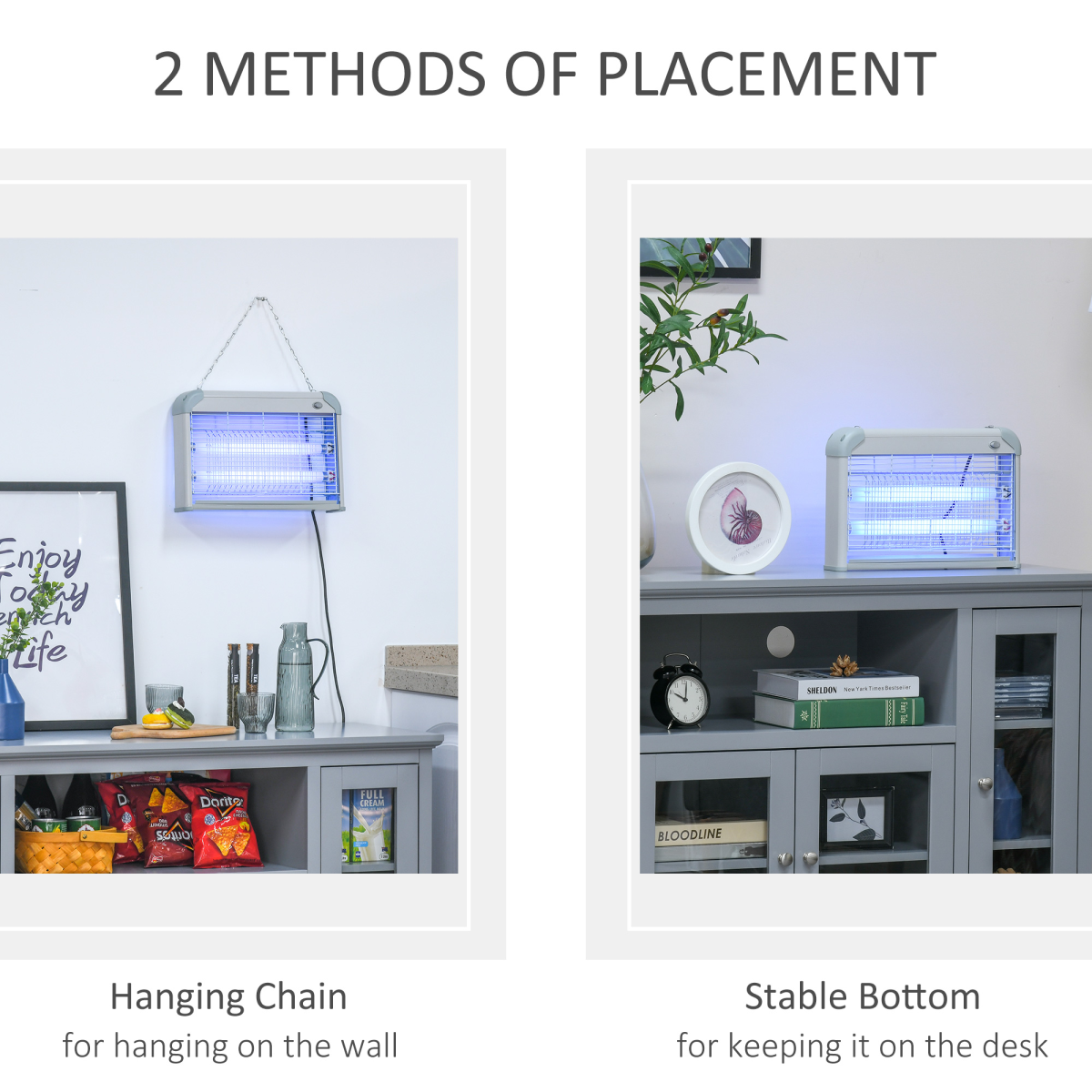 - Features energy-efficient, non-radiative, noiseless and odorless; Performs well with 20W high efficiency and 60? effective room coverage; A fully enclosed external steel net offers protection from electric shocks; A hanging chain is included for wall-mounted use to provide better effect; Features a removable collection tray slot for easy cleaning of insect; Remains electric for an hour after power outage; Ideal for patios,decks,balconies and other occasions requiring effective mosquito control;