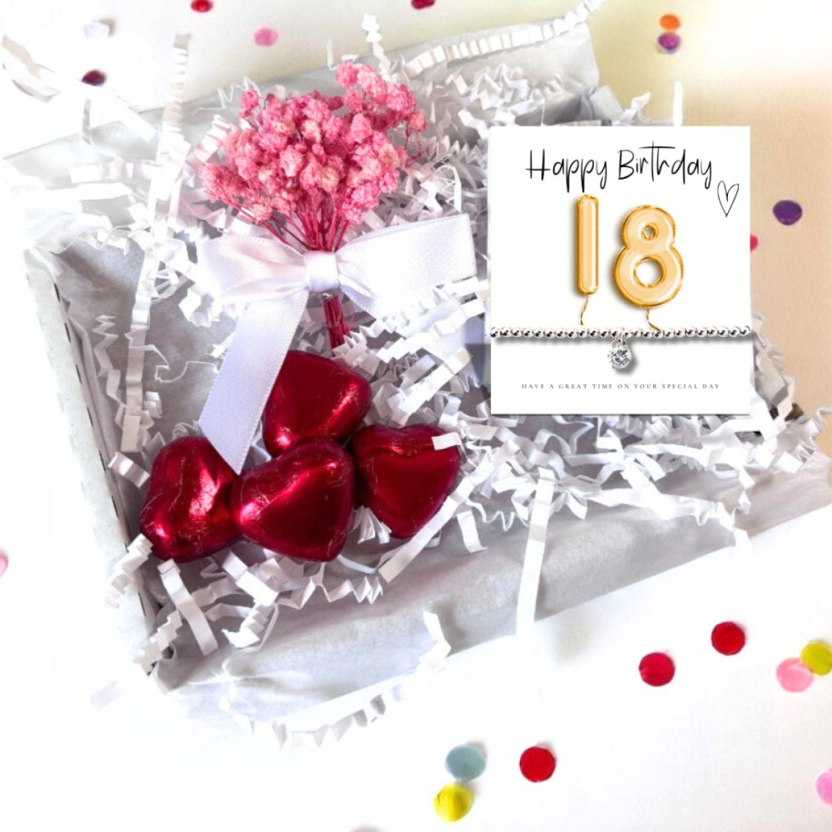 Make the 18th birthday of a special someone with our cubic zirconia beaded stretch bracelet on a gold balloons message card and comes with four delicious milk chocolate hearts filled with a creamy caramel centre and a cute mini flower bouquet. This lovely bracelet is a great gift for the birthday girl. Choose to add a special message or send blank, either way, it's a gift that will be cherished for years to come.