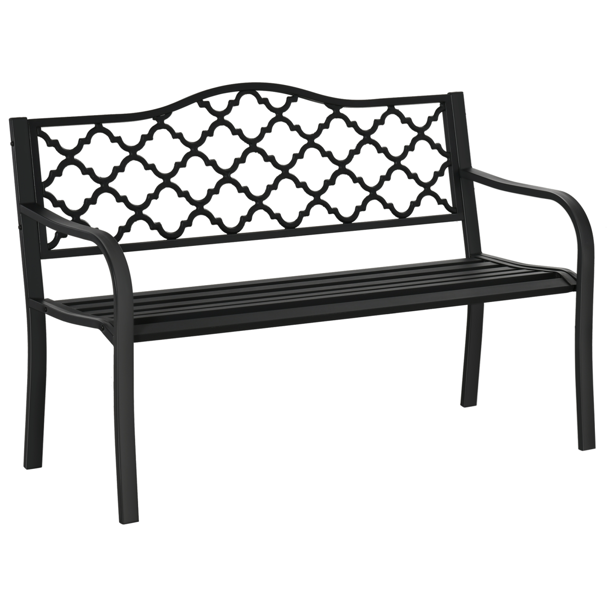 Distinctive pattern on the bench's back gives it a true vintage antique feel Matte black finish complements any setting and looks great with any decor style Constructed with sturdy steel and cast iron for stability and durability Slatted design is good for draining on rainy days Protective footpads prevent scratch on the frame and the floor Assembly required