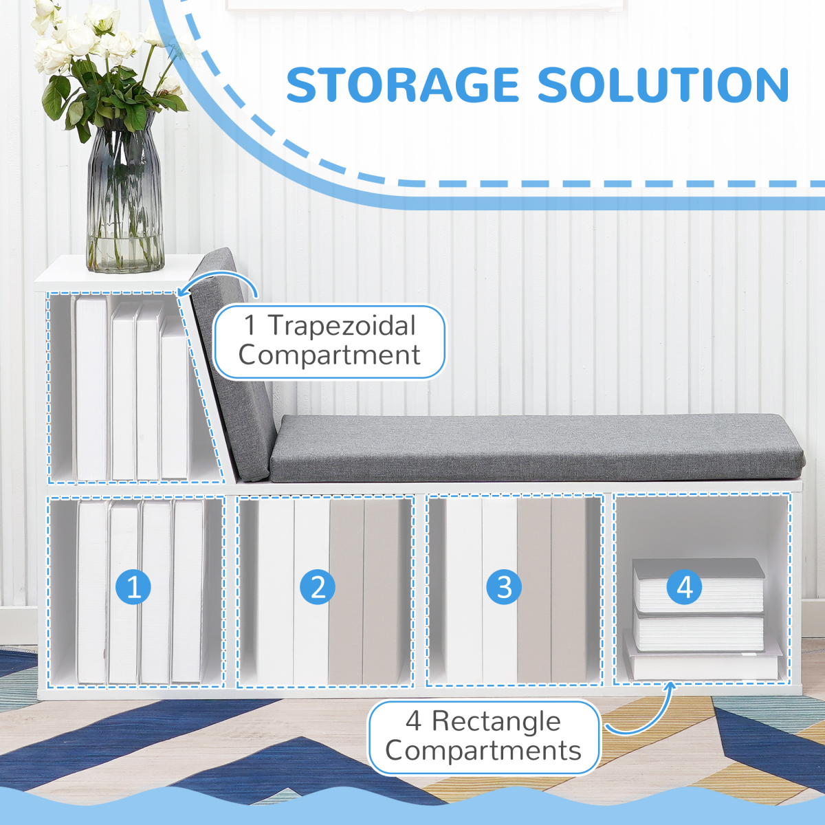 Modern Style: The modern appearance makes this white bookcase match most styles. Comes with a geometric compartment shape, it will add a touch of simplicity and elegance to your home.Storage Solution: Features four bottom compartments and a trapezoidal one on top, this bookshelf is ideal for storing your favourite books, magazines, CDs, plants, and decorations neatly and orderly.Comfortable Cushion: Comes with two cushions, this bookcase allows you can sit there when you're reading or having a rest. Besides, the cushions are removable, and the cover is detachable with a zip, which is convenient to clean. It can also work as a storage unit or a display cabinet in your study, bedroom, or living room.Solid Construction: Crafted of particle board, this small bookcase has a steady structure and safety height that is stable and reliable for your daily use.Dimensions: Overall Dimension: 108W x 30D x 60H cm. Weight Capacity: 5 kg (compartment), 120 kg (bench). Assembly required.