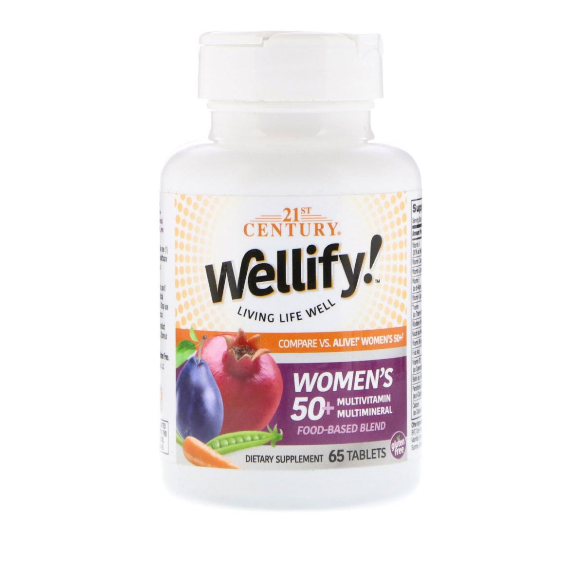 Live Life Well Compare Vs. Alive Women's 50+ Food-Based Blend Dietary Supplement Gluten Free Guaranteed Quality - Laboratory Tested Living life with your health and wellness in mind is living life well! Wellify Women's 50+ Multivitamin Multimineral helps support overall energy, immunity, heart health, bone health, eye health and cellular health.