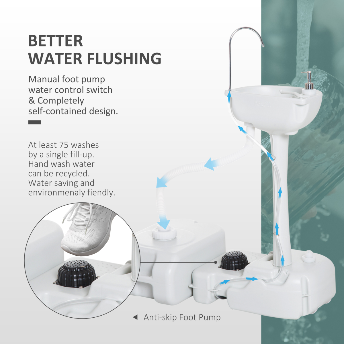 OUTDOOR CONVENIENCE: This portable camping sink makes water easily accessible outdoors. Great for outdoor social events, worksites, camping, boating, etc. Handle free operation by just stepping on the foot pump to get a stream of water. And it's also easy to assemble, no tools required.HIGH QUALITY MATERIAL: Mainly made from HDPE plastic for durable use, which is suitable for outdoor use. Safe for the whole family to use.GENEROUS CAPACITY: The water tank of the mobile hand sink provides you 17L water readily available for use which will surely accommodate plenty of campers or travelers in each refill. Includes one 24L recovery tank for easy empty.PERSONAL HYGIENE: Includes an integrated liquid soap dispenser, towel holder and a flexible drainage hose ensures you to direct waste away with great ease, these additions ensure you're able to maintain a healthy level of hygiene no matter where you are.PORTABLE: The portable hand wash stand offers you a lightweight and handy design allowing you to bring it anywhere. Built-in handle and rolling wheels enables you to transport it even when filled with water.