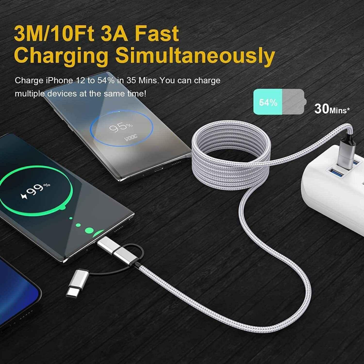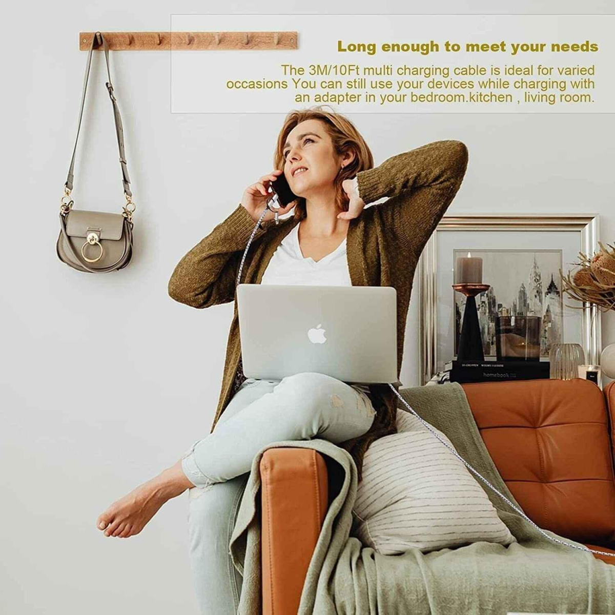 • Long with 6FT 3 way charger Extra 10ft/3M long multi charging cord is ideal for the long distance usage at home, in your office, car, on your travel and more places. Never worry about not having sufficient reach from your Phone charger cable. One universal cell phone charging cord is enough when you are on a business trip or traveling.
