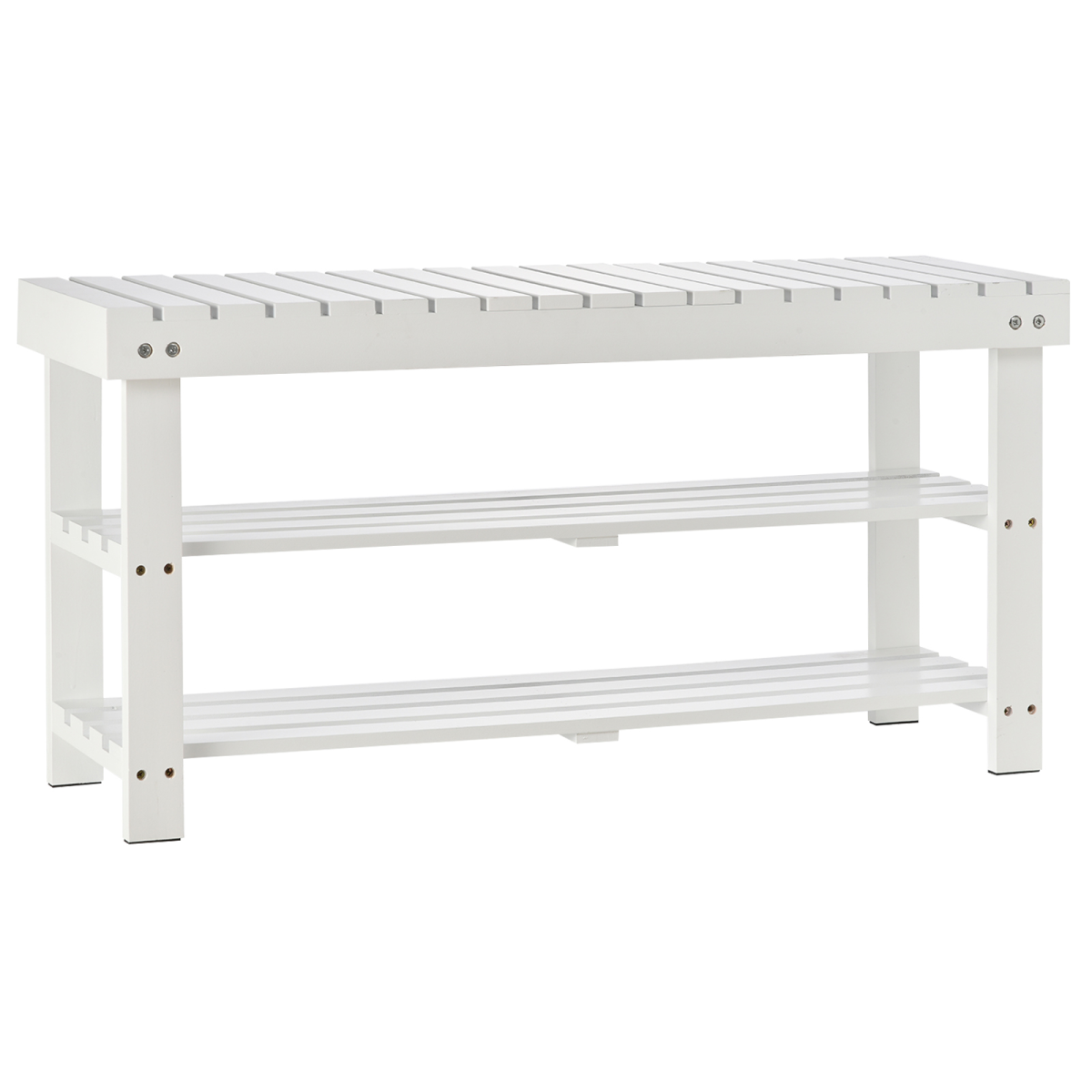 EASY SHOE STORAGE: Three spacious shelves, providing plenty of room for keeping shoes, boots and heels organised and together in one place.HIDDEN COMPARTMENT: Located in the middle of the top shelf, it creates extra and concealed storage - great for polish, shoe laces, keys and more.DURABLE: Pine wood frame for a steady structure, with MDF shelves to handle everyday use.OPEN DESIGN: Paired with the slatted shelves, keeps shoes aerated and fresh for hygiene, as well as being easy to grab. Foot caps on feet to protect your floor. DIMENSIONS: 45H x 90L x 29Dcm. Inner compartment: 23.1L x 29Dcm.MAXIMUM WEIGHT CAPACITY 130KG. ASSEMBLY REQUIRED.
