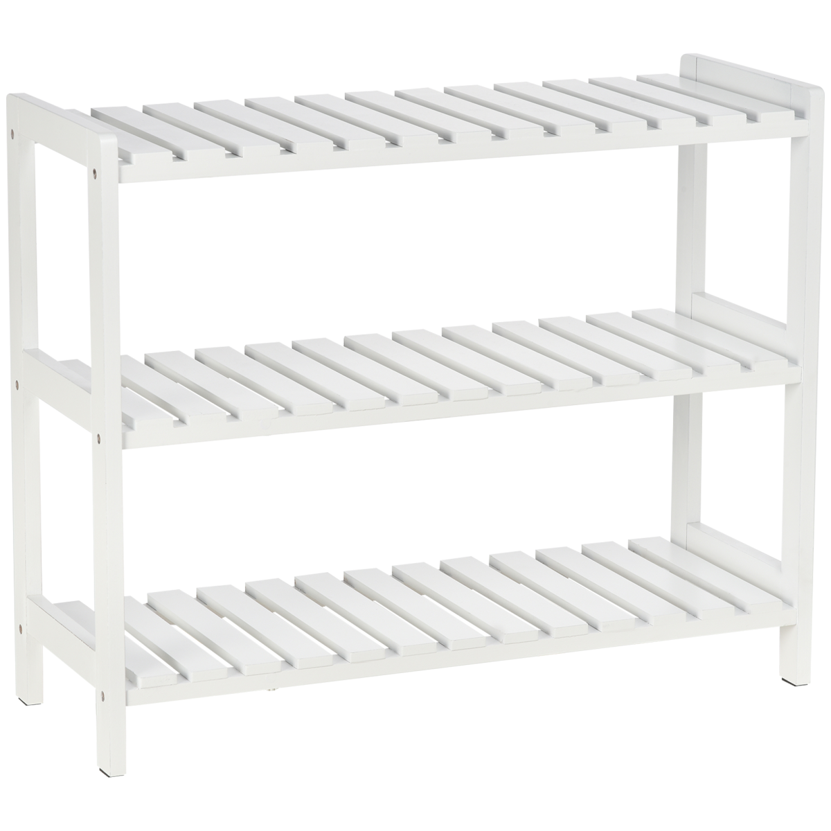 EASY SHOE STORAGE: Three spacious shelves, providing plenty of room for keeping shoes, boots and heels organised and together in one place.DURABLE: Pine wood frame for a steady structure, with MDF shelves to handle everyday use.OPEN DESIGN: Paired with the slatted shelves, keeps shoes aerated and fresh for hygiene, as well as being easy to grab.FOOT CAPS: Ensures balance and protects your floor from marks. MAXIMUM WEIGHT: Whole: 9kg. Shelf: 3kg.DIMENSIONS: 57.5H x 70W x 26Dcm. Between shelves: 20.5cm. ASSEMBLY REQUIRED.