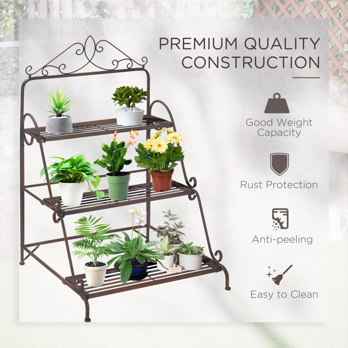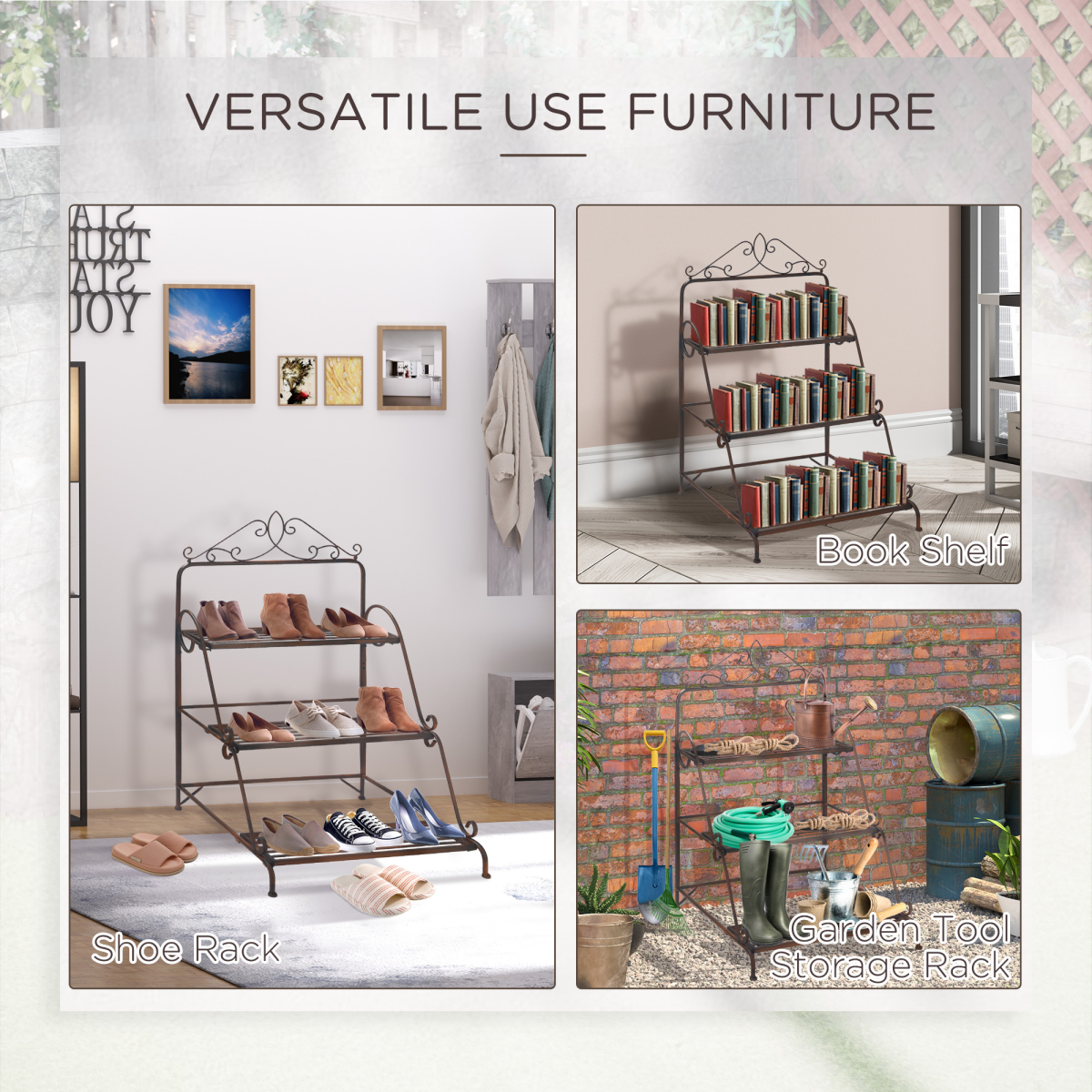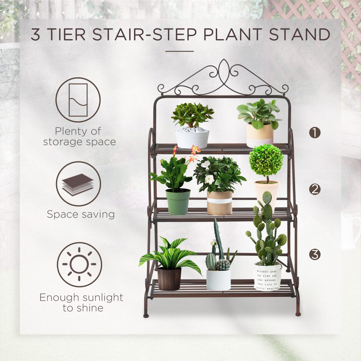 3-tiered freestanding outdoor plant stand made of metal and featuring elegant scrollwork accent Vertical design, space-saving and practical Sturdy metal construction that solid and durable Smooth surface, easy to keep clean and maintain Can also be used to place towels, sundries, shoes, books, or other essentials Assembly required