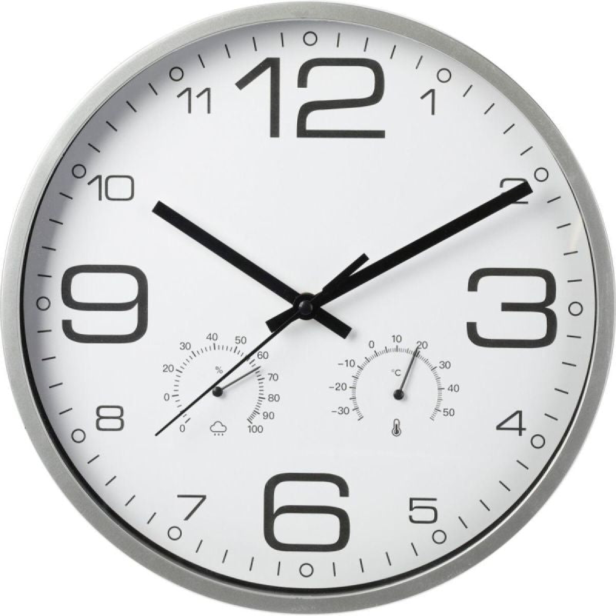 The 30CM SILVER WALL CLOCK WITH THERMOMETER is a modern clock with a clear display of time, temperature, and humidity. Its simple, minimalist design is perfect for offices, modern interiors, and even workspaces.