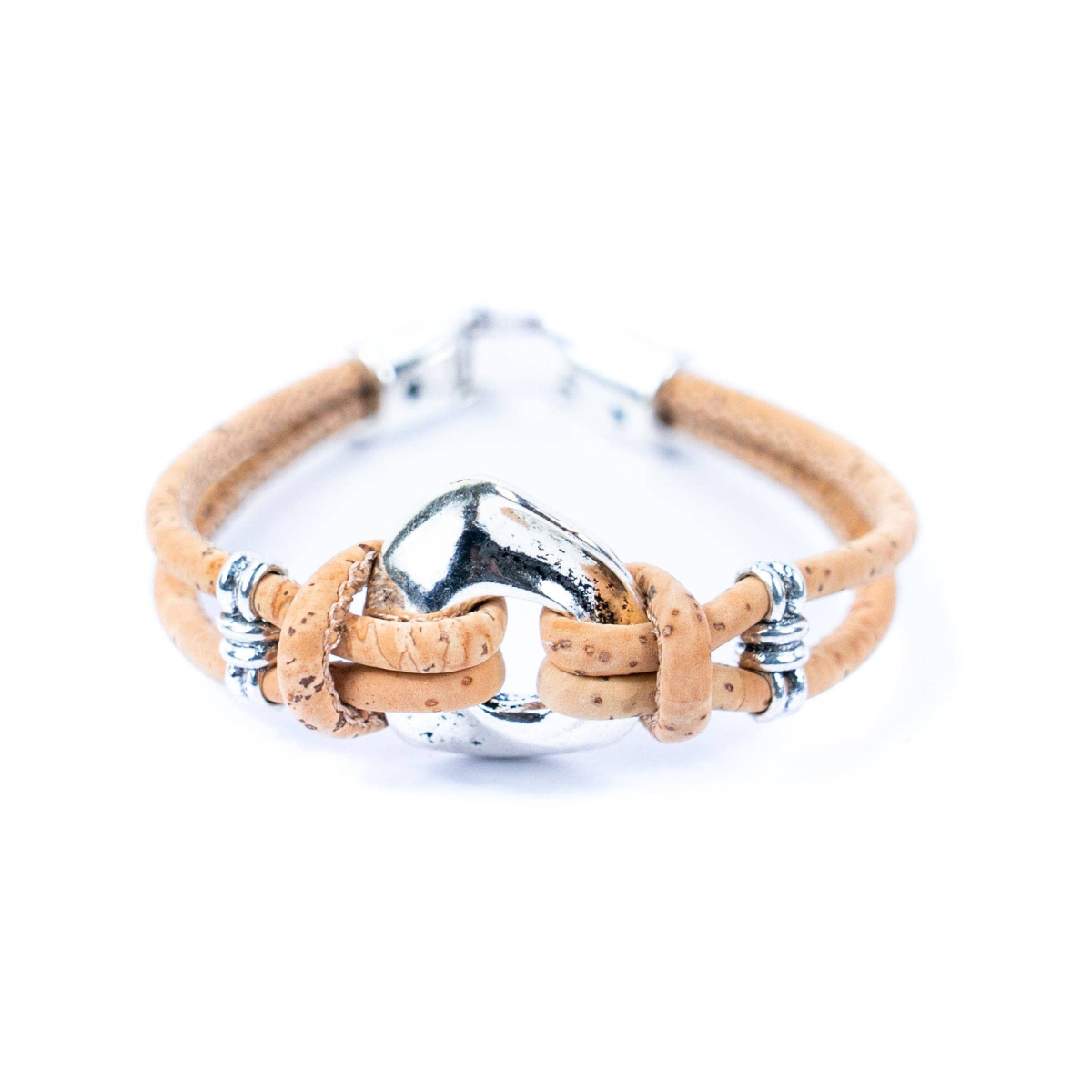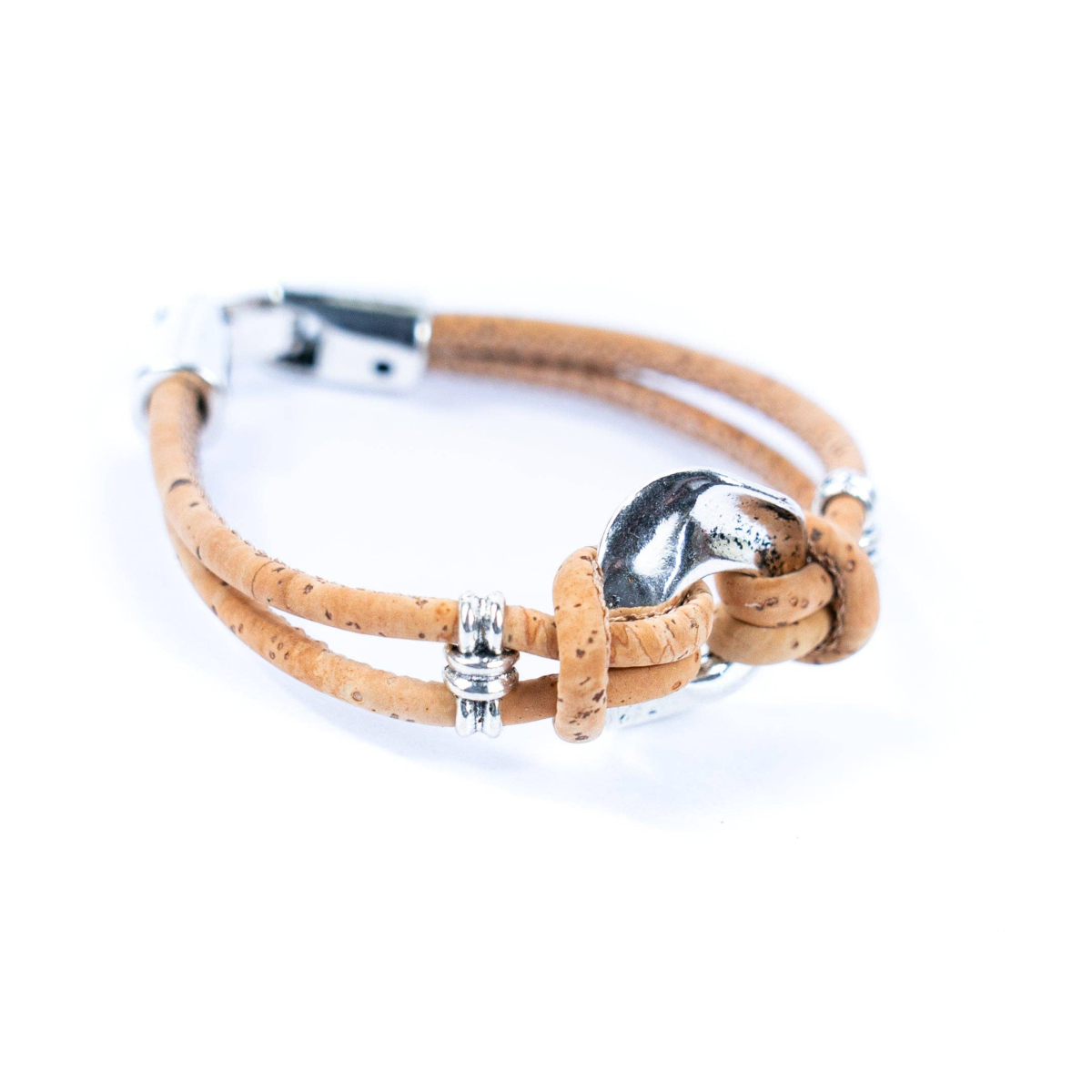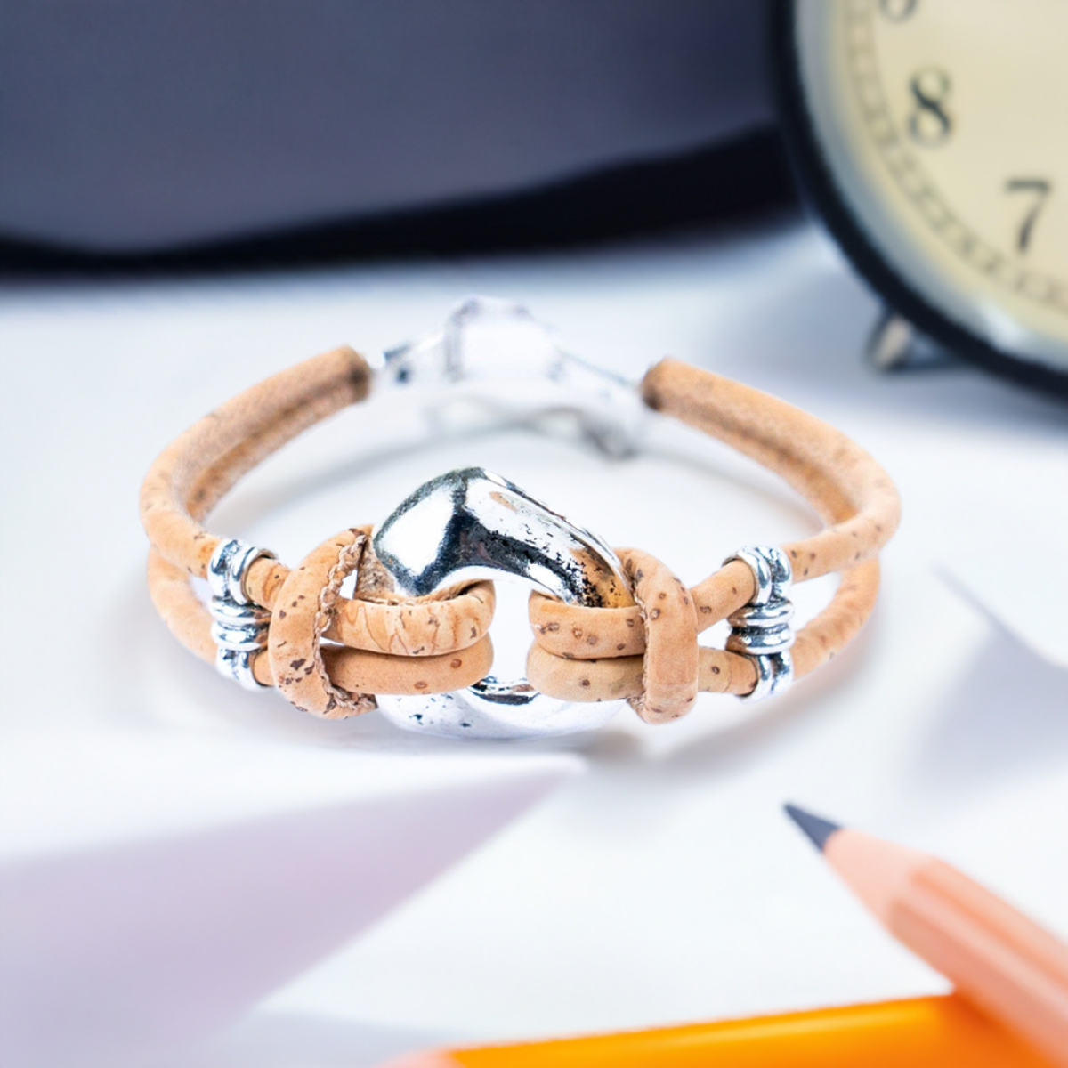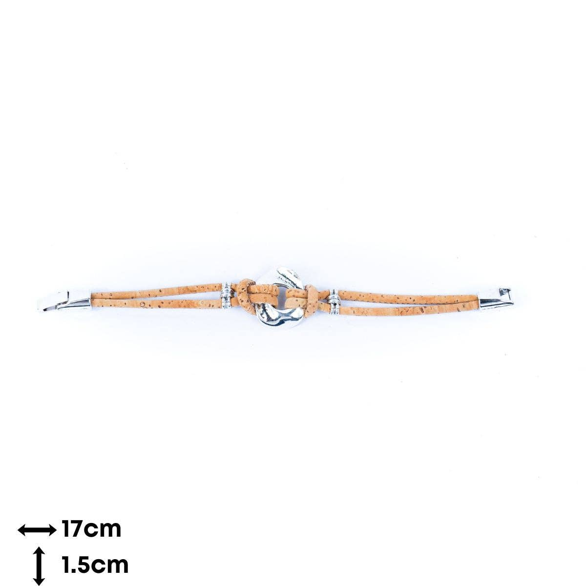 The natural colour of the cork threads creates a serene and sophisticated atmosphere, making it an ideal accessory for various occasions and styles. Whether dressing up for a special event or keeping it casual for everyday wear, this bracelet adds a touch of refined charm to your ensemble.