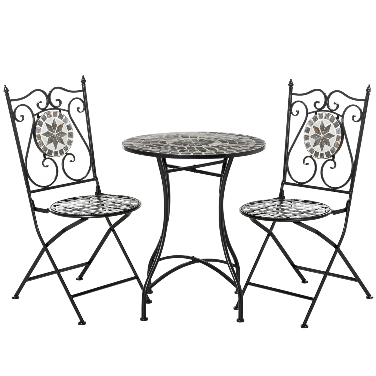 Decorative ceramic table top and chair panels are wear-resistant and easy to clean