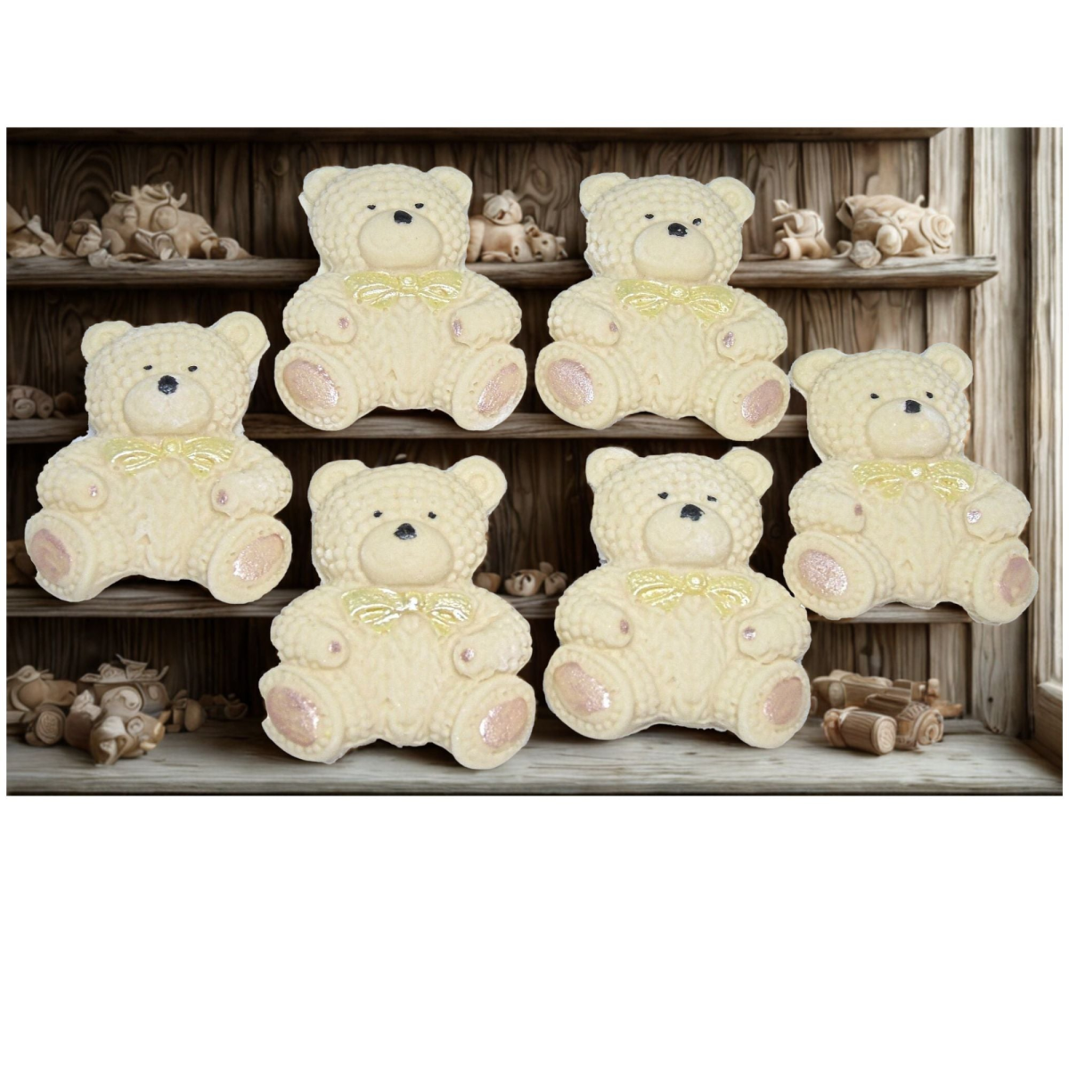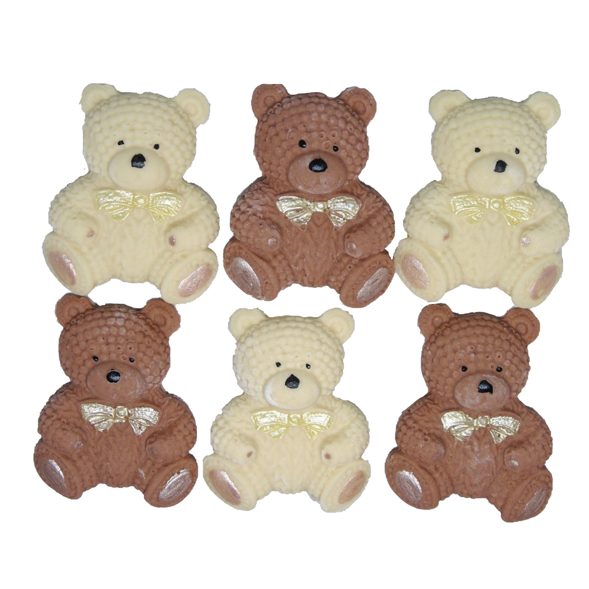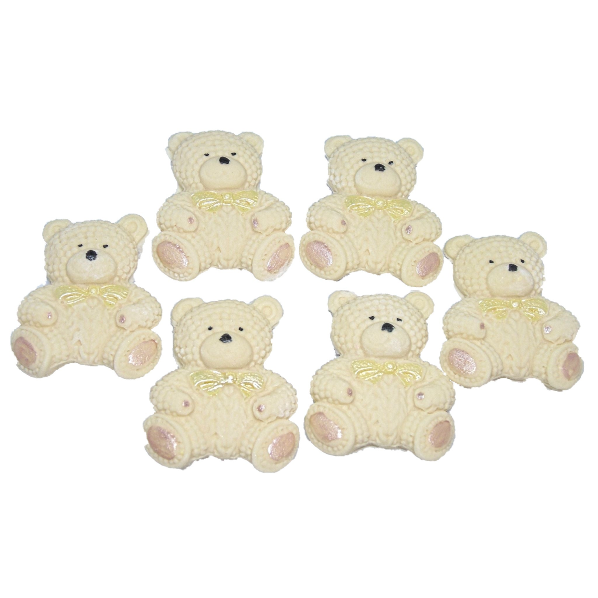 6 handmade baby teddy cupcake toppers. Vegan, dairy-free, and gluten-free, these adorable knitted effect edible teddy decorations are perfect for all occasions.