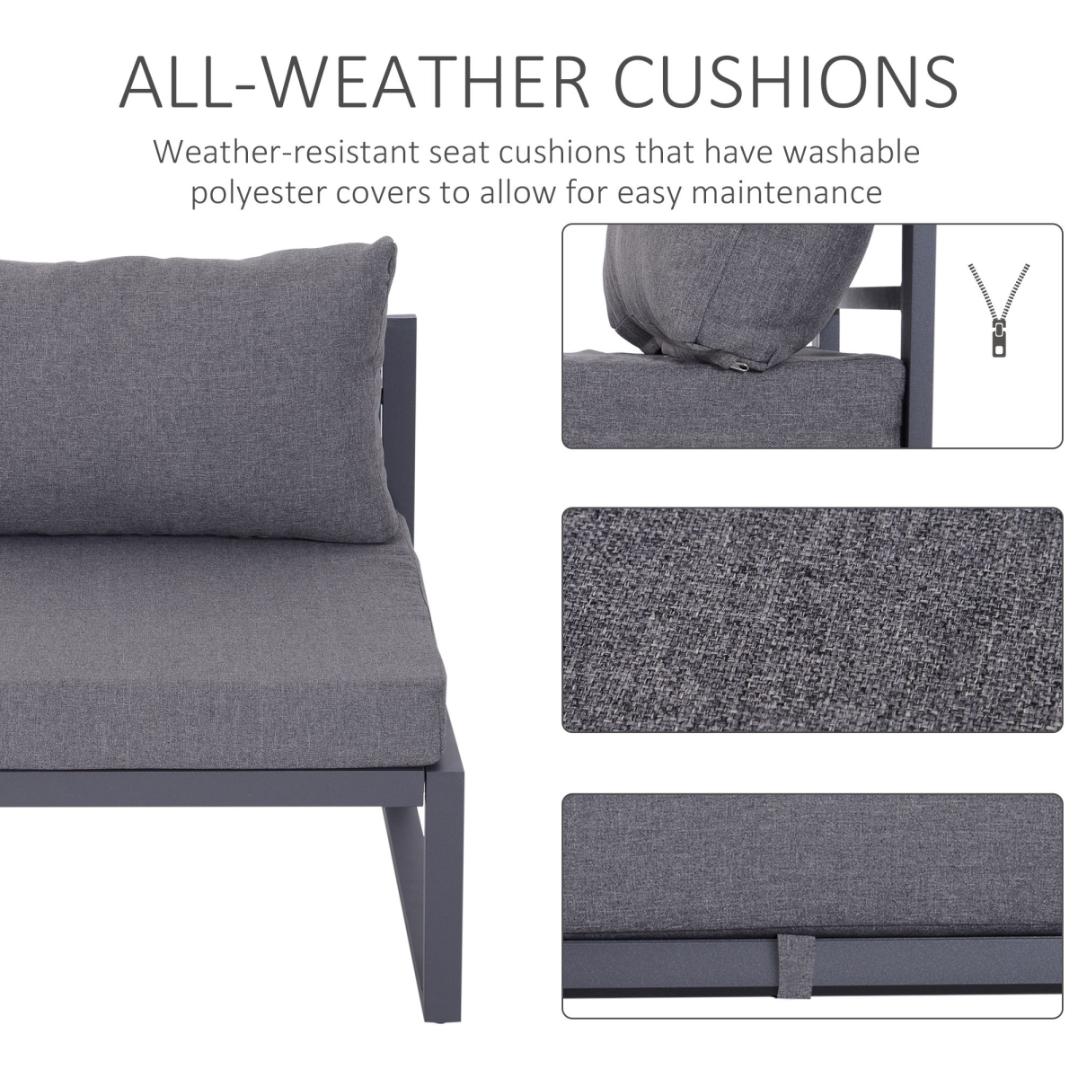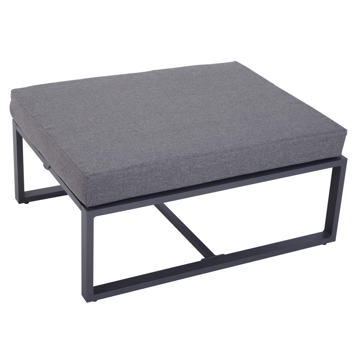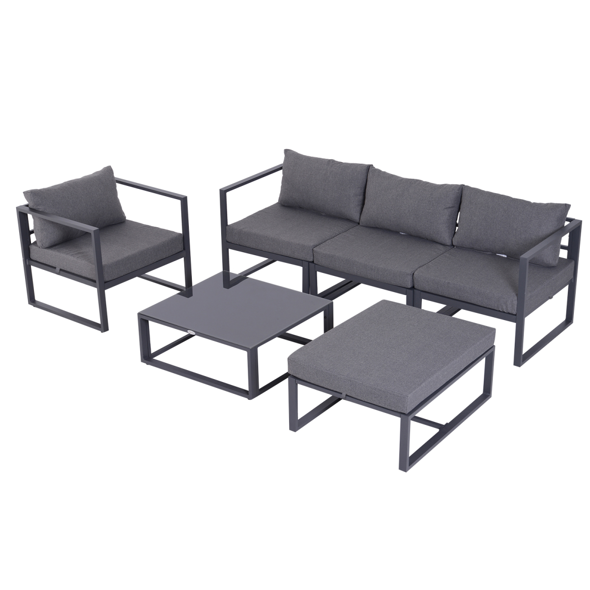 SIX PIECE GARDEN DINING SET: Includes one armchair, one middle chair, two corner chairs, one footstool and one coffee table, suitable for garden, patio,deck, poolside and any other outdoor space.COMFORTABLE: The dining set comes complete with weather-resistant seat cushions that have washable polyester covers to allow for easy maintenance.Thick padded cushions provides the ultimate comfort for all day relaxation.ALUMINIUM FRAME: Constucted of aluminium frame which is rust and weather-resistant . It is light-weight and easy to care. Armed with adjustable feet for stability on uneven groundTEMPERED GLASS TABLETOP: Adds a slick finishing touch and can be wiped clean easily.DIMENSIONS: Armchair: 73W x 65D x 63Hcm. Middle chair: 65L x 69W x 63Hcm. Corner chair: 65W x 65D x 63Hcm. Table: 65L x 65W x 30Hcm. Footstool: 83L x 65W x 30Hcm. MAXIMUM WEIGHT CAPACITY: Chair: 160kg. Table: 30kg. ASSEMBLY REQUIRED.