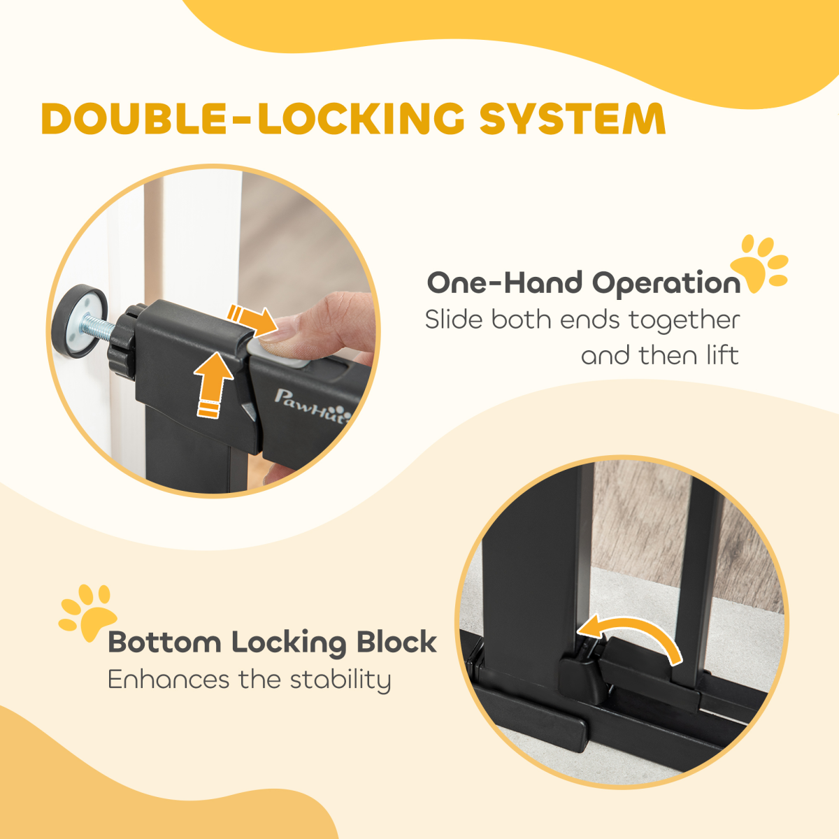 - DOUBLE-LOCKING SYSTEM: Adult can open the door with one hand by sliding the button on the top (Need to slide both ends at the same time and then lift). Comes with the bottom locking block, it enhances stability, ensuring your pet is secured in place.