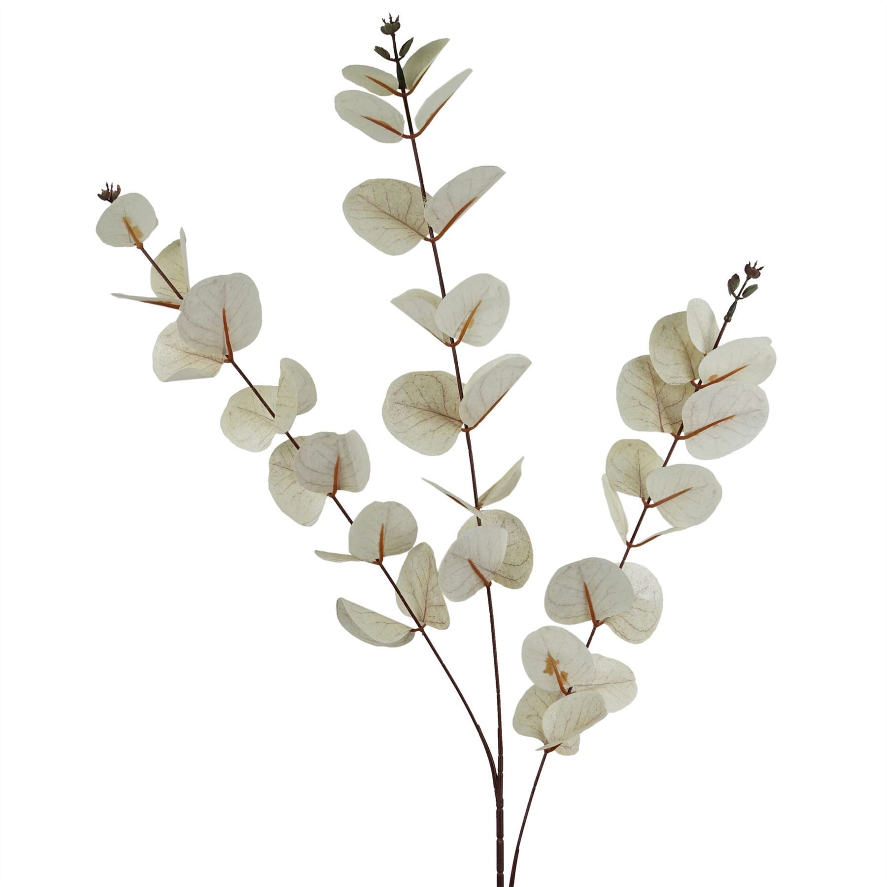 Realistic white Eucalyptus single stem with silk leaves and wired shapable stem. Can be used to make arrangements with our other artificial flowers or as decorations on their own. Each stem measures 80cm overall height x 20cm. These are easy to cut down shorter using a pair of wire cutters if required. Some of our photos show vases to give an idea of size and possibilities for arrangement but no vases or planters are included with this foliage.