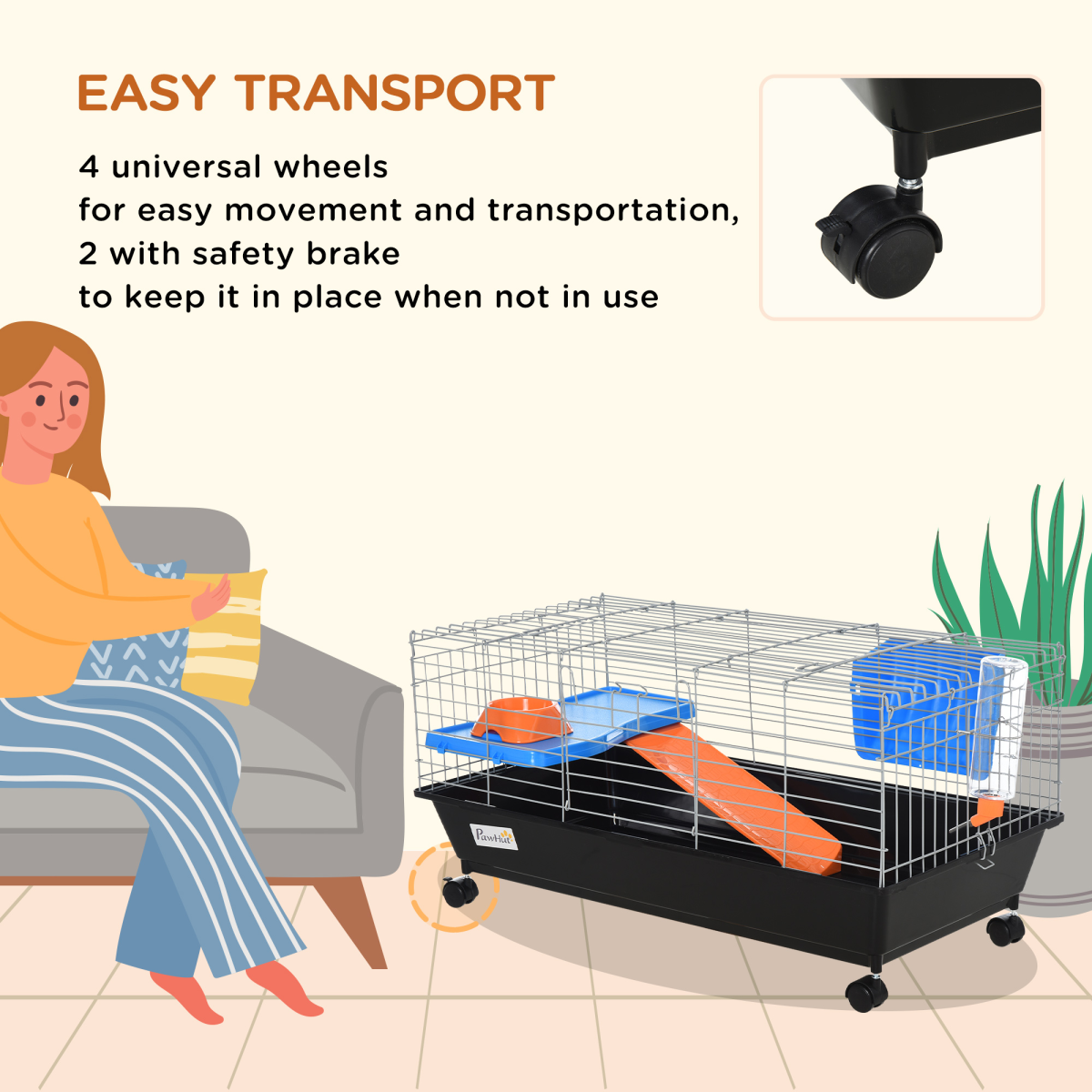 - four wheels for easy movement, can be locked - Ideal for small rabbit, pet mink, Chinchilla, guinea pig and other similar sized small pets - large front door and top door for easy for cleaning and refilling of essentials - deep base to contain litter and other debris easily - features a platform with ramp, a hay feeder, water bottle and food dish - safe outer metal caging, with bar spacing for fresh air flow - NOTE: not Suitable for hamster - simple Assembly required