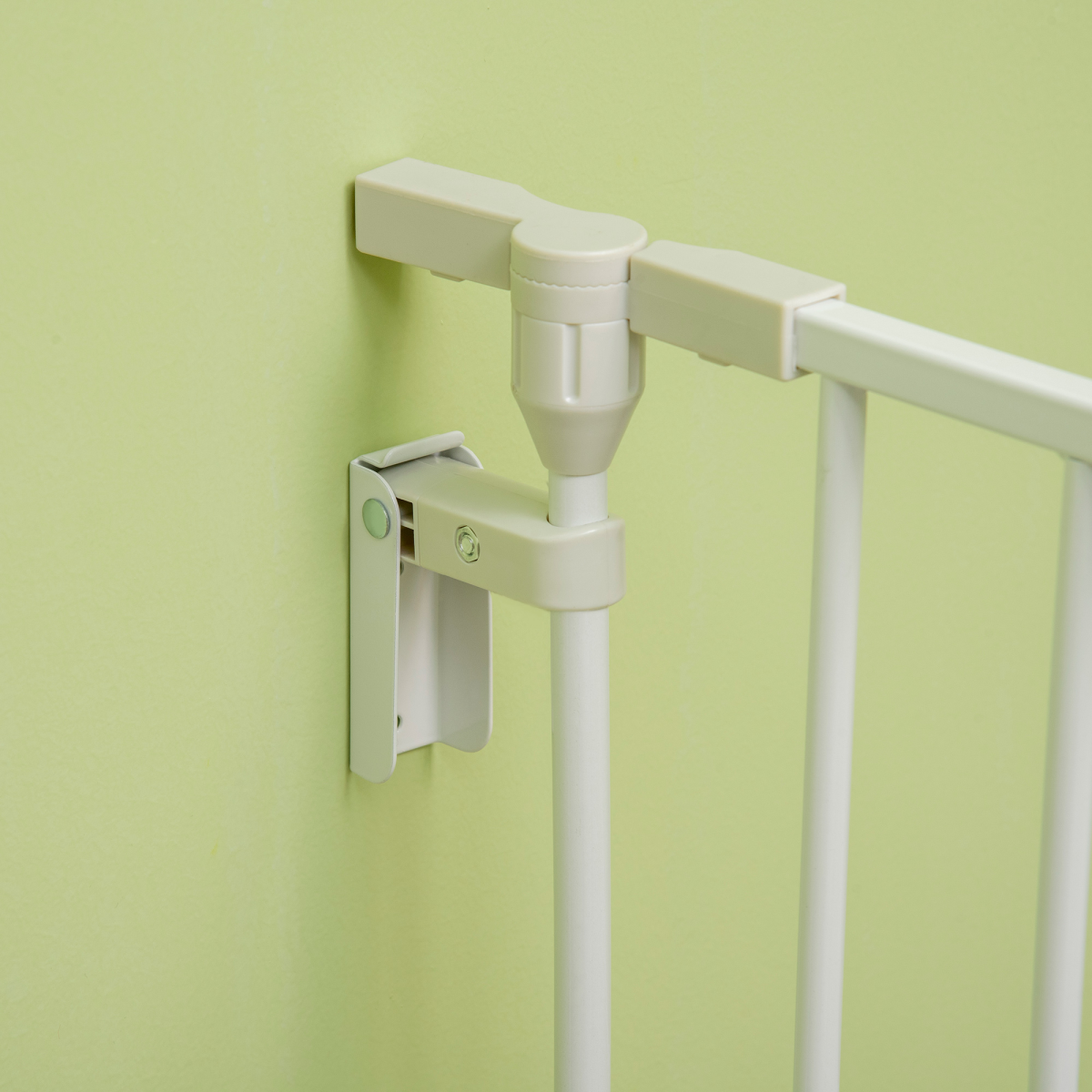 - "Pet Gate 5-Panel Dog Playpen for Indoor Stair Barrier with Walk Through Door, White" - Description: - Can be used as a freestanding gate or mounted on the wall with included accessories - Can be used as a pet playpen, safety gate, Christmas and stove fence, room divider, etc. - The door can be closed automatically when its opening angle is less than 90 degrees, and stay open when it goes over 90 degrees (The door won't close when its angle is less than 15 degrees). - This pet gate can be formed in any shape you want, such as L-shape, U-shape, pentagonal, etc. - Pull back the button and lift to open the door. - Strong metal frame with powder coated finish, safe and durable for long-term use. - Foldable design for easy storage and transport. - Suitable for small and medium-sized dogs between 25cm and 50cm in height at the shoulder.