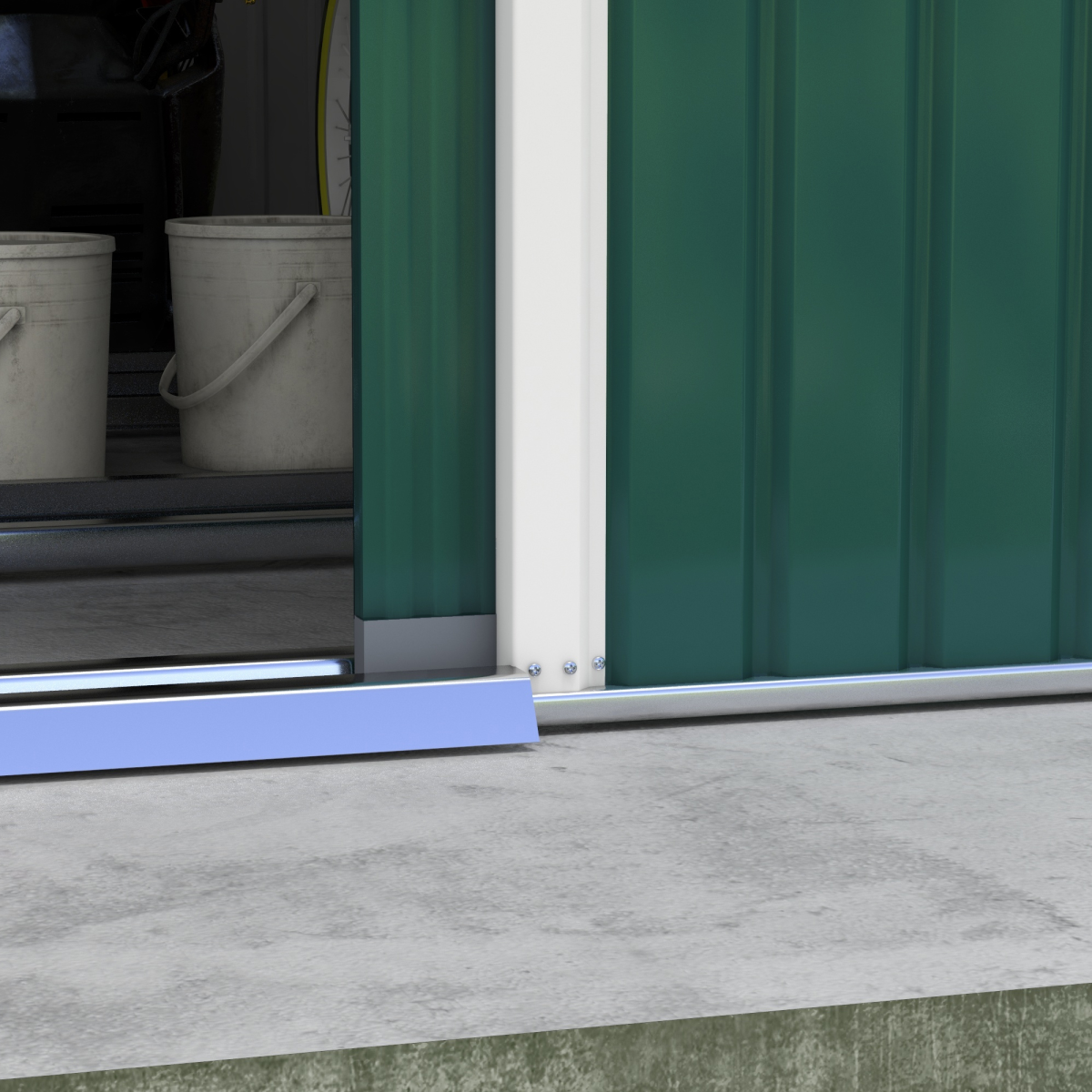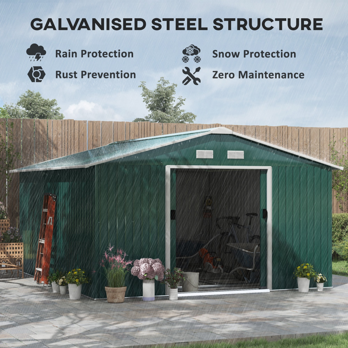 Serve as a tool shed, a bike shed, a mobility scooter shed, or a garden bin storage Spacious enough for storing all your outdoor tools, equipment and gardening gear in this galvanised shed Made from colour steel with a top coat for durability and protection against the elements Sliding double doors for easy access this metal storage shed Sloping roof for water to roll to floor, helping to prevent rust build-up Four ventilation to air to pass through this bike storage metal shed Floor foundation included, with all parts pre-cut and pre-drilled please use gloves when installing Assembly required