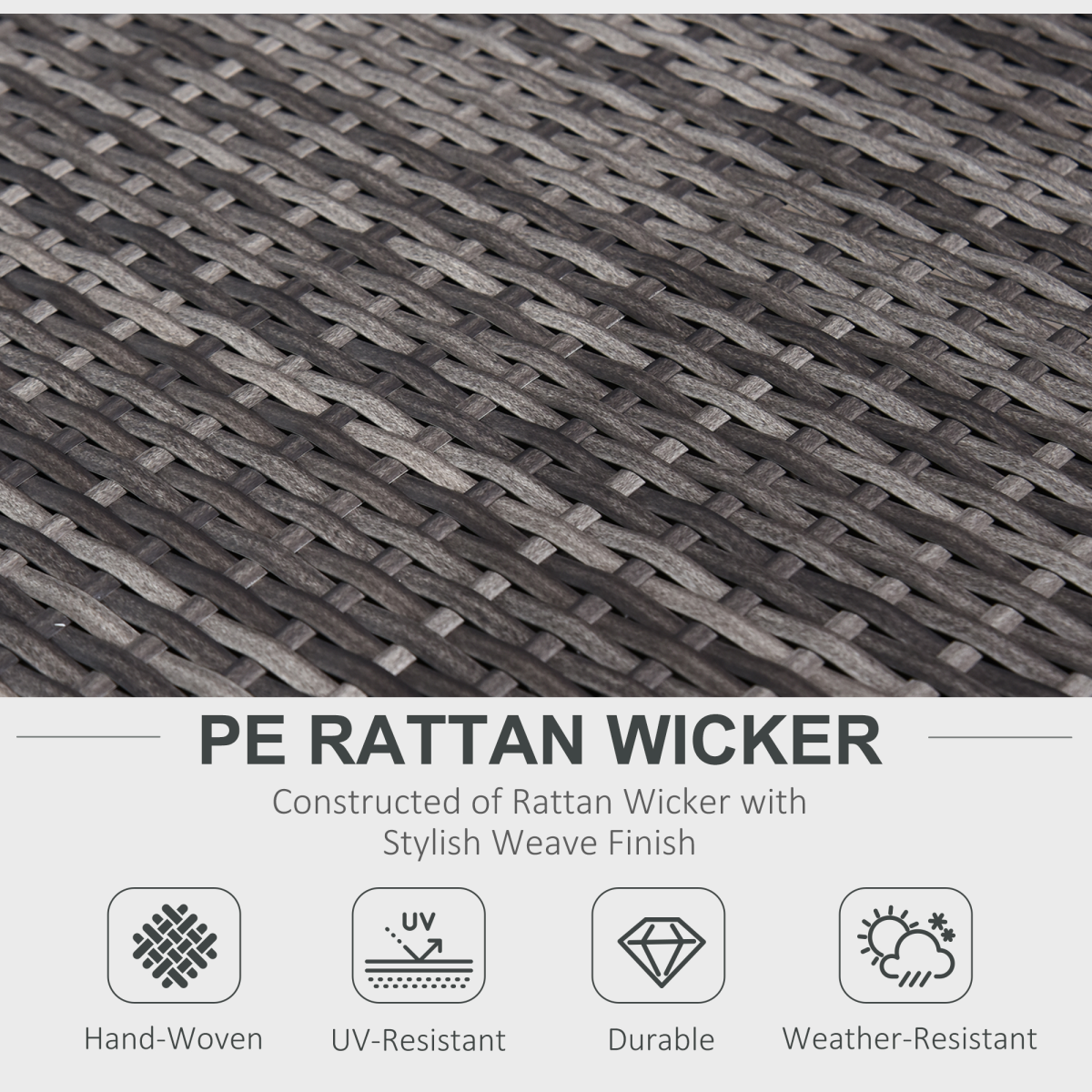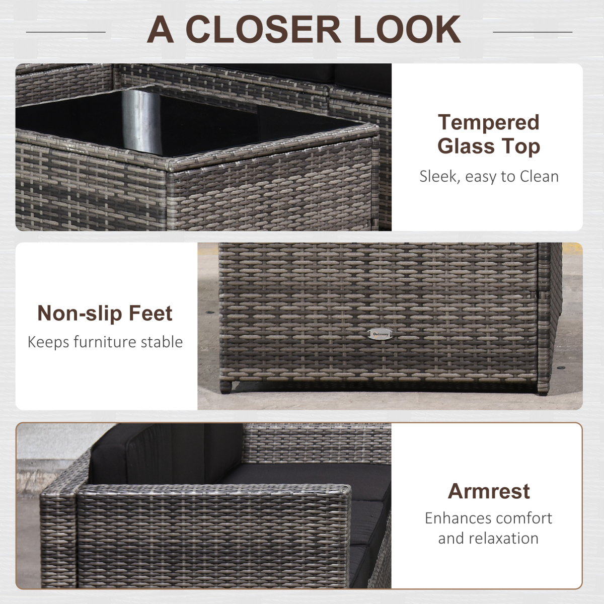 Outsunny 6-Seater Rattan Sofa Furniture Set W/ Cushions, Steel Frame - Grey" Description: - Stylish outdoor seating set consisting of four seats, two corner seats, a corner table, and a coffee table with a sleek tempered glass top - Made from PE rattan with a strong steel frame underneath for long-lasting use - Hidden storage compartment in the corner table for convenient organization - Comfortable back and seat cushions with removable and washable covers - Can be arranged in multiple ways to suit your needs - Great for home use, cafes, bars, restaurants, etc. - Assembly required