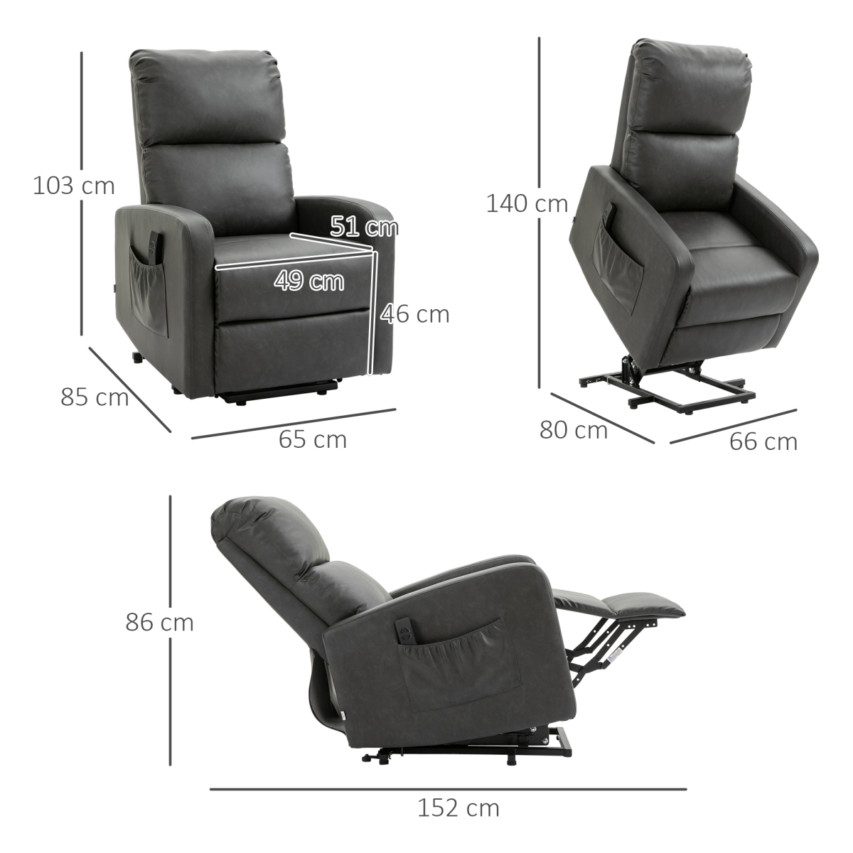 LIFTING ASSISTANCE: Guiding users into an almost standing position in security, makes it a great riser recliner chairs for the elderly and those recovering from any injuriesRECLINING CHAIRS: Reclines up to 145and you can adjust it to any position you like for reading, watching TV, or taking a nap. The built-in footrest allows you to stretch legs and keep a relaxed body posture for the ultimate lounging experienceCOMFORTABLE AND STURDY: Upholstered in faux leather and extra thick foam padding with pocket spring system, our lift chairs provide extraordinary comfort, stretchy and bounce to lay back and relax in. And it's?built?from?wood?and?solid?steel?with?an?anti-tipping counter-balanced?lift?mechanism for durable useEASE-TO-USE: Press a button on the remote to get in and out, or recline. Convenient side pockets help keep the controller and other essential items nearbyRECLINER ARMCHAIR DIMENSION: Overall Dimension: (Upright) 85W x 102D x 103H cm, Overall Dimension: (Reclined) 85W x 163D x 78H cm. Chair to Wall: (when reclining) 80cm. Seat Size: 57W x 57D cm, Seat Height: 49cm. Weight Capacity: 150kg. Assembly required