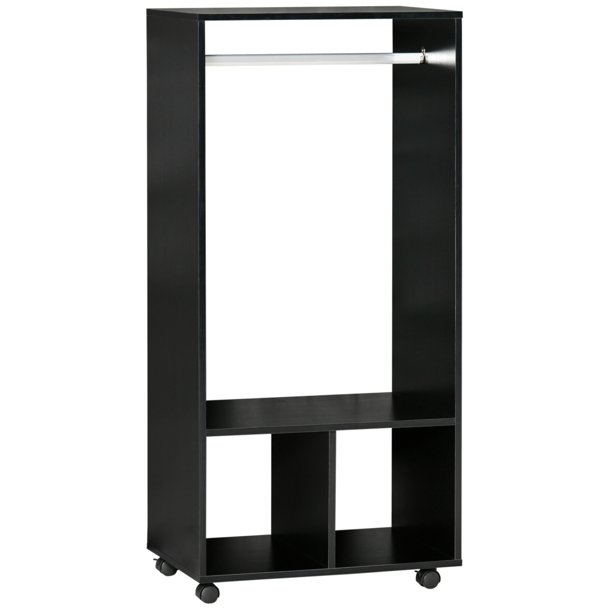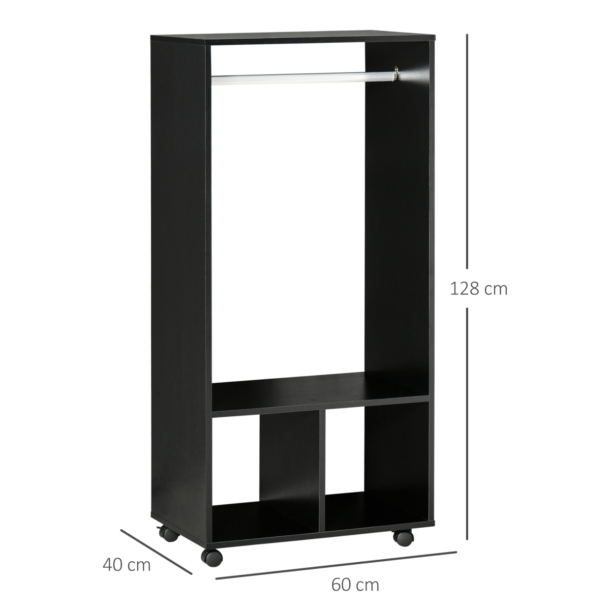 OPEN DESIGN: An easy way to grab your clothes, whenever. Also keeps them smelling fresh. Two bottom shelves suitable for folded clothes, shoes and bags.FOUR WHEELS: Easy to move the wardrobe around your home - even when full of clothes. Two can be locked so it stands in place.ALUMINIUM RAIL: Solid pole, holds clothing hangers securely in place. Easy to push hangers side-to-side.DIMENSIONS: 128H x 60L x 40Wcm. Shelf: 30H x 27.8W x 40Dcm.MAXIMUM LOAD: Whole: 15kg. Hanging rod: 5kg. ASSEMBLY REQUIRED.