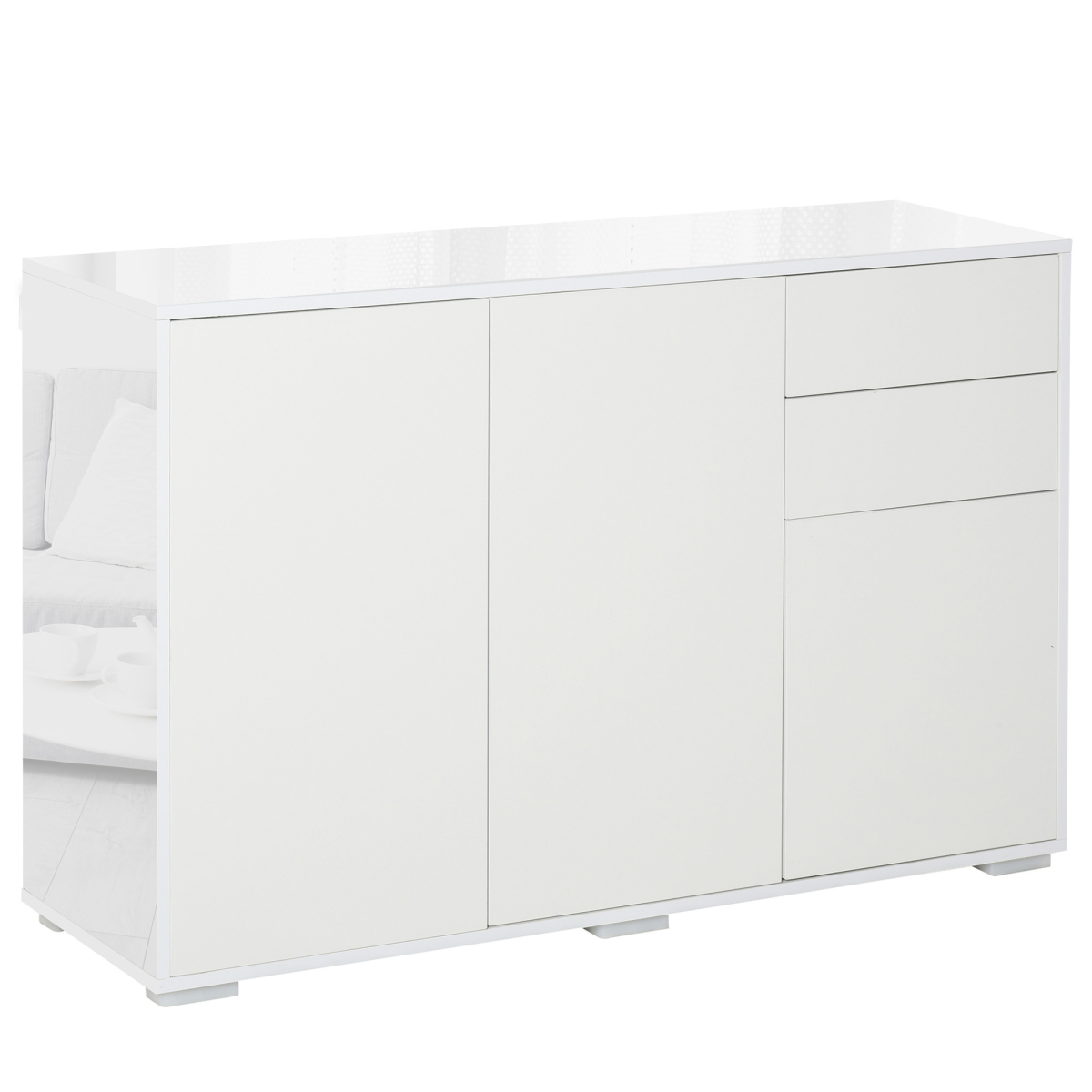 GLOSSY AND MATTE COMBO: Do you still have a hard time deciding between a glossy and a matte cabinet? The cabinet combines the two for a sophisticated look that is effortless. In contrast to the matte finish on the front panels, the glossy finish on the top and side highlights the cabinet's outlines, enhancing the feel of light and spaceMULTIPLE STORAGE COMPARTMENTS: Features two drawers, two cabinets and a flat table top, giving you plenty of room for keeping plates, boxes and more discreetly stored. Small cabinet features an three-level adjustable shelf.PUSH OPEN: Simply one click, and your drawers and cabinet doors open themselves. Saves time and effort.ANTI-TIPPING DESIGN: This freestanding furniture features an anti-tipping strap and can be fixed to the wall to prevent it from tipping over. DIMENSIONS: 74H x 117W x 36Dcm.MAXIMUM LOAD 50KG. ASSEMBLY REQUIRED.