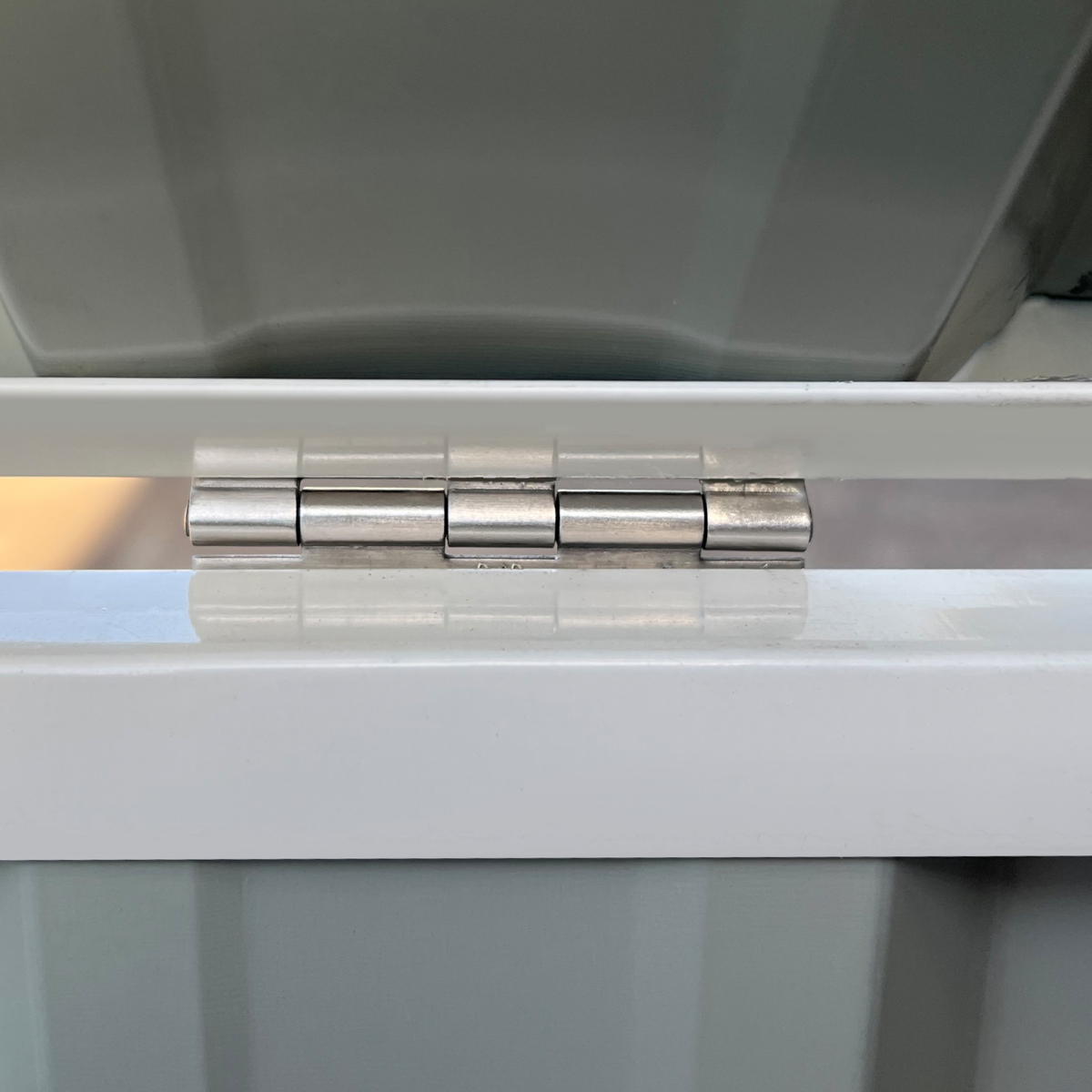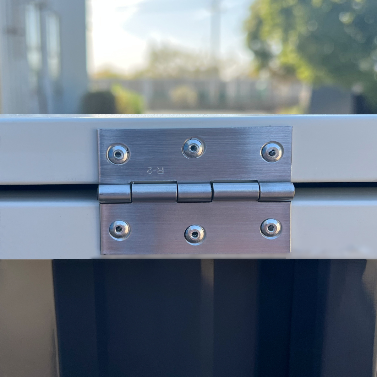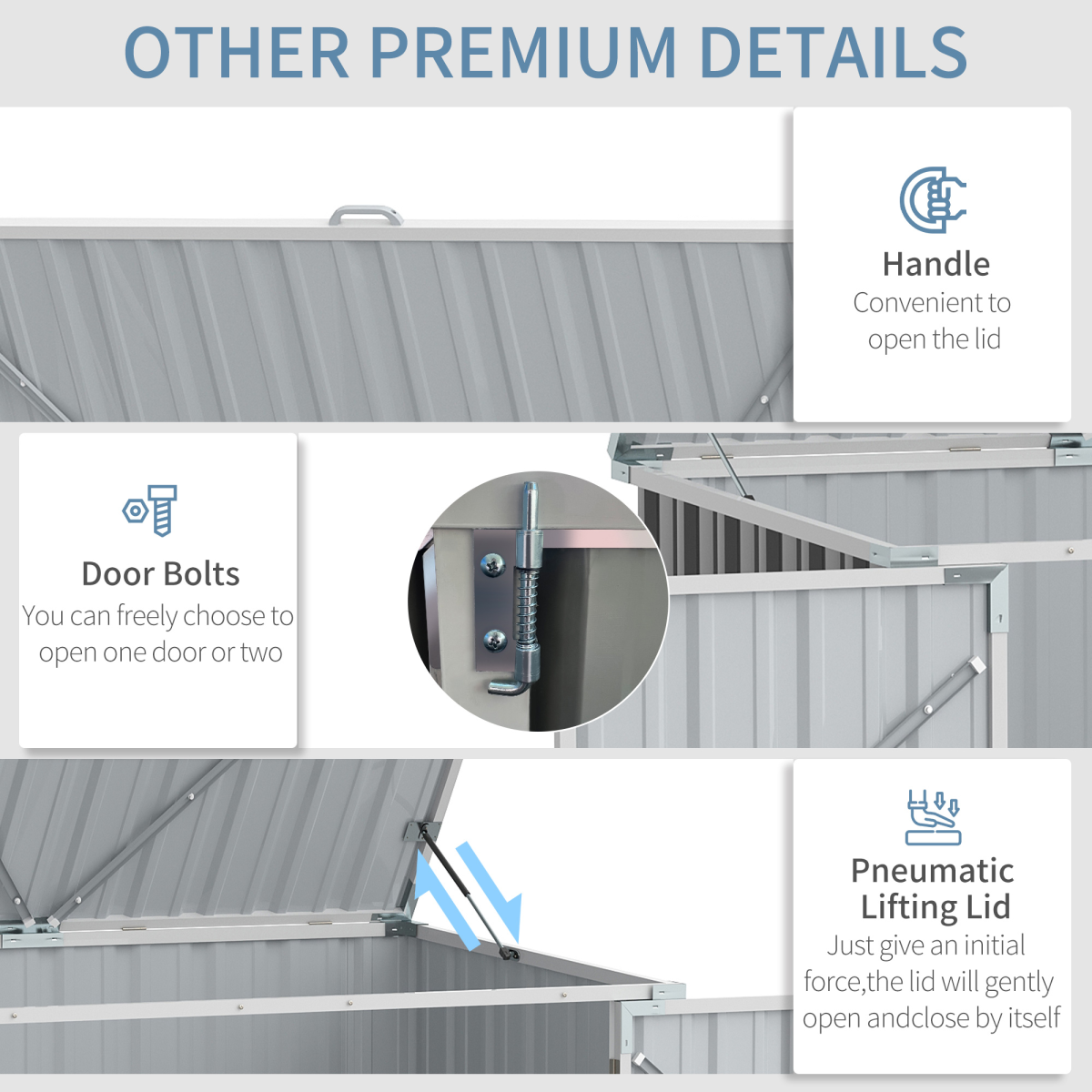 HOLDS TWO BINS: Classic-look shed storage is suitable for keeping household rubbish and recycling wheelie bin together. Keeps your home front/back tidy and hygienic.CORRUGATED STEEL FRAME: A strong structure making this storage unit suitable for extended outdoor use - with a weather-resistant coating for extra protection.EASY ACCESS: Two front doors to move the bins in and out. Lift-up lid to place the rubbish easily in the bins.SECURE: Three locks to keep both the front doors and lid closed securely. Pair of gloves included for installation.DIMENSIONS: 128-133H x 144L x 94Wcm. INNER SIZE: 128H x 139L x 83Wcm. ASSEMBLY REQUIRED.