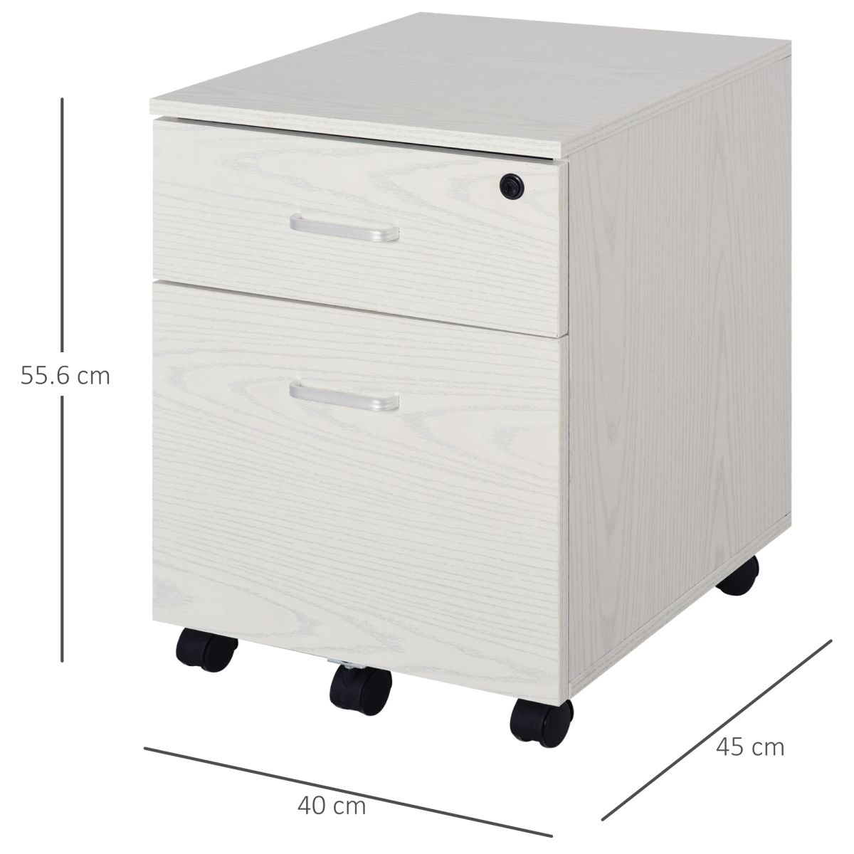 COMPACT SIZE: Fits underneath desks easily, helping to keep the room tidy and organised without taking up too much space.TWO DRAWERS: One small and one large, giving you lots of space for holding files, folders, stationery and other office essentials. Bottom drawer features rail for holding A4 files vertically.PARTICLE BOARD BODY: A solid construction which is sturdy enough for everyday use in an office environment. Metal rails open and close the drawers smoothly and quietly.LOCKABLE AND EASY MOVEMENT: Keeps your private files safe. Comes with two keys. Features a wheeled design with 5 casters for smooth and easy movement. 4 are large and 2 are lockable with 1 under the file drawer for added stability.DIMENSIONS: 54.6H x 40W x 45Dcm. Bottom drawer inner: 27.5H x 30.6W x 38Dcm. MAXIMUM LOAD 50KG. ASSEMBLY REQUIRED.