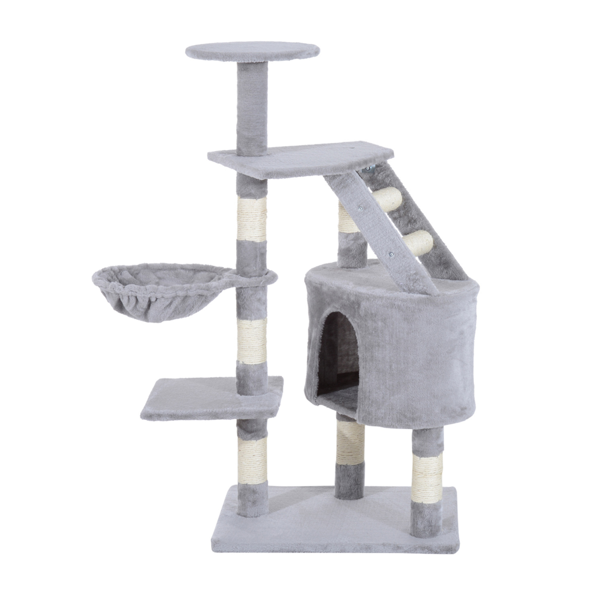 ALL-IN-ONE CENTER: Multi-level cat activity centre with sisal rope scratching posts, ladder, cosy basket, roomy condo and perches for endless entertainment.SAVING YOUR FURNITURE: With cat scratching post wrapped with durable natural sisal ropes, this cat tree for indoor cats is perfect for your cats to sharpen their claws, and save your furniture from scratching and digging.SOFT PLUSH FABRIC: Covered with soft and comfortable plush fabric, making this cat climbing tower the perfect resting area.STURDY & SAFE: Made of solid particle board to keep the large cat tree strong, stable and pet friendly.DIMENSION: Overall Dimension: 55L x 40W x 125Hcm. Cat House Size: 45L x 30W x 30Hcm. Door Size: 18W x 22Hcm. Assembly required.