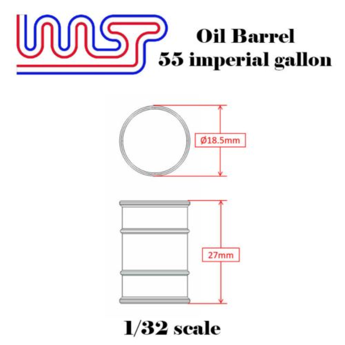 3D printed in the colour shown and supplied with self adhesive decals, (which need to be cut to size). In packs of 5 (6 for mixed packs ) Size Diameter 18.5mm Height 27mm based on 55 gallon oil drums