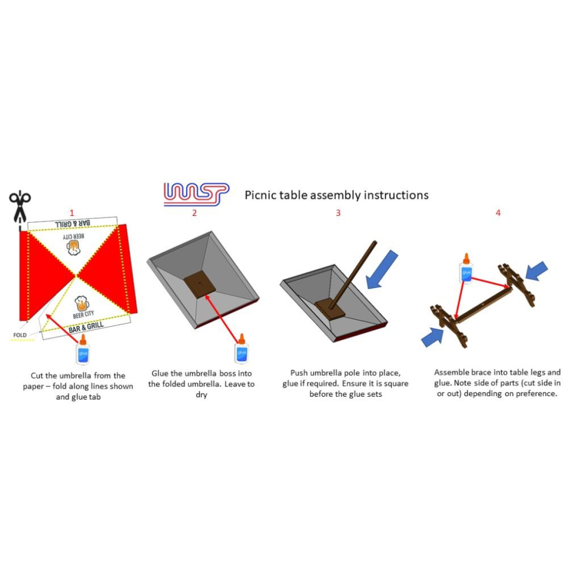 WASP Picnic table and umbrella, 1:32 scale kit 3D printed in colour shown and supplied as a kit to assemble with umbrella decal sheet. Decals inkjet printed on 160 gsm card to cut out and assemble. Please see photos for assembly instructions. Only 1 table and umbrella is included in single listing, figures and other accessories in the picture are for illustration only. Safety - Please note these tyres are intended for slot racing purposes only, they are not a toy and should not be used by children under 12 years. They could be a choking hazard if swallowed