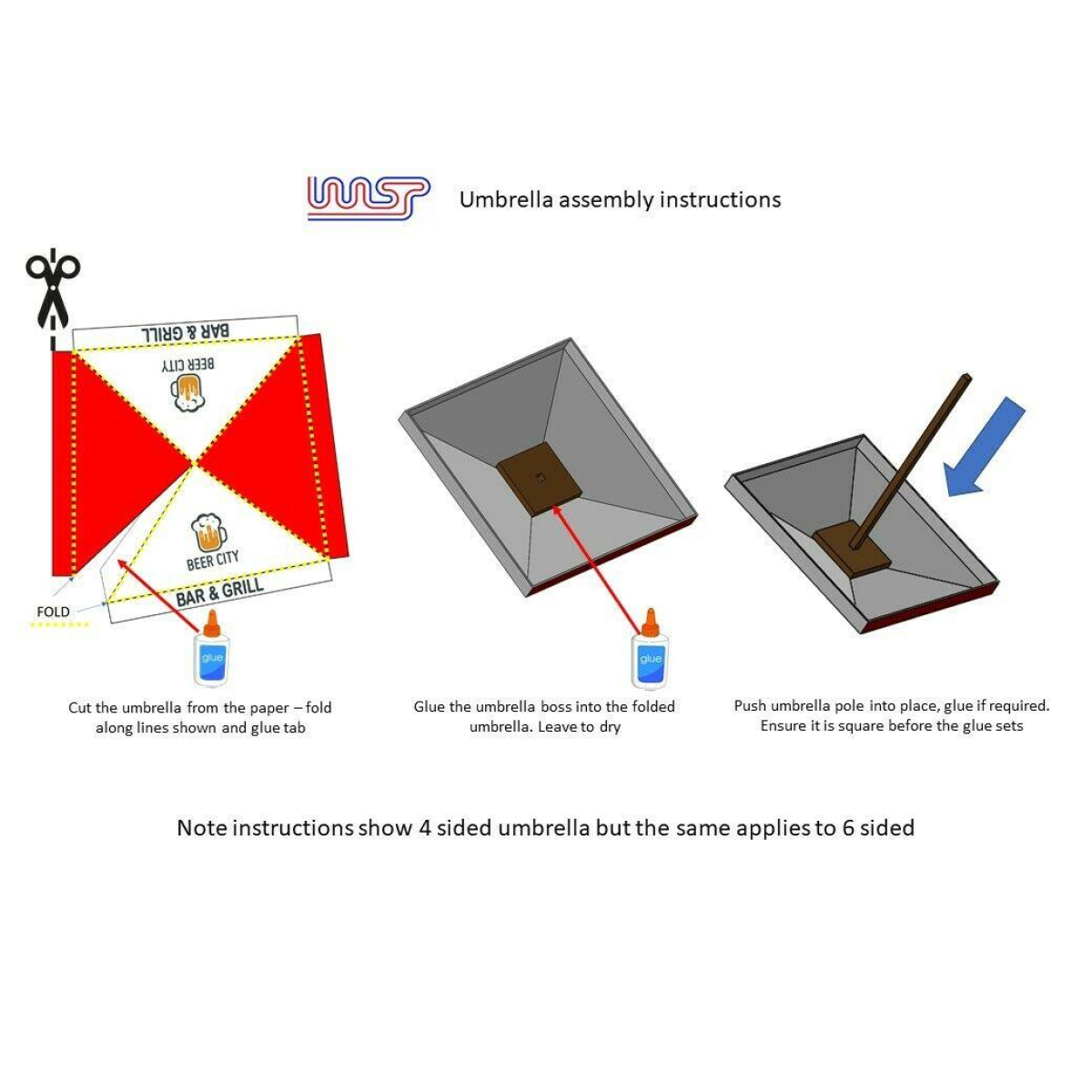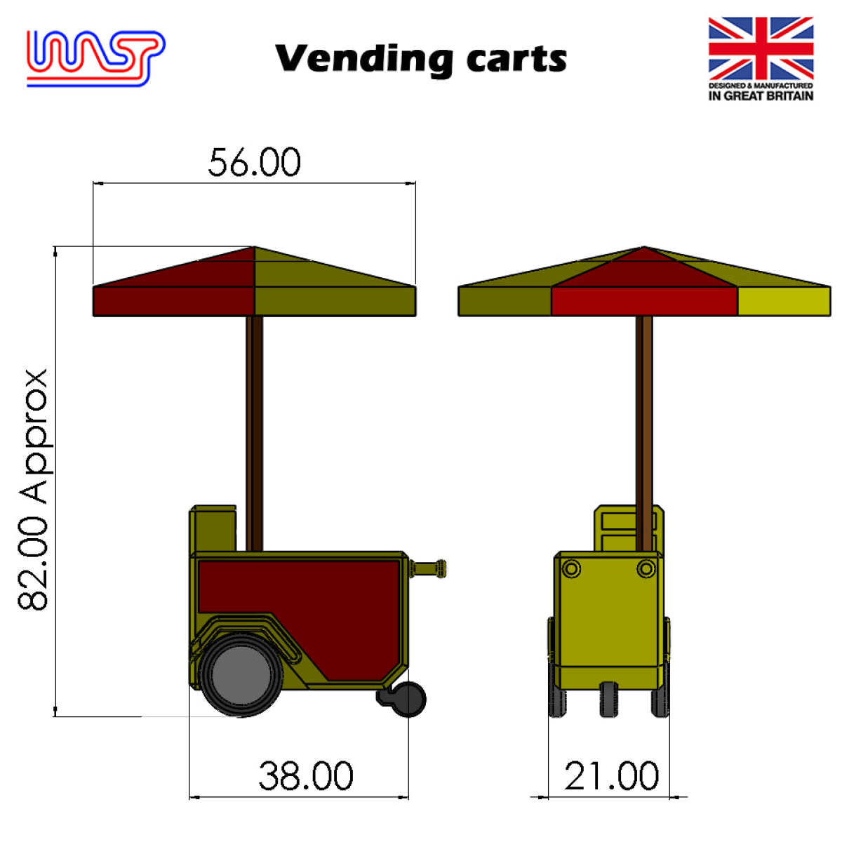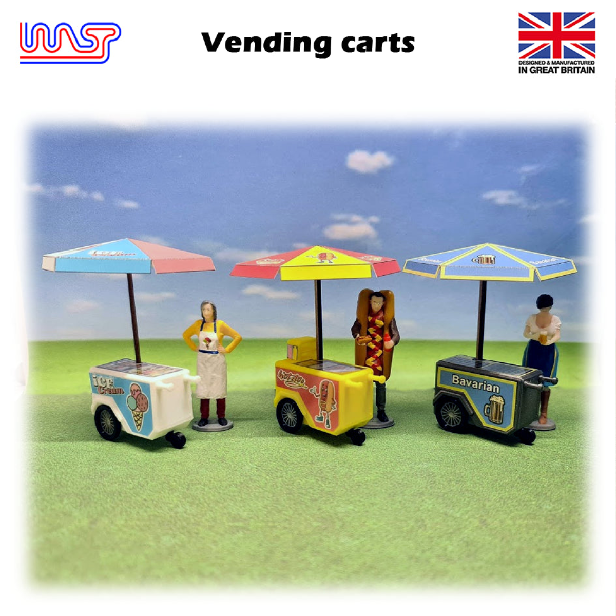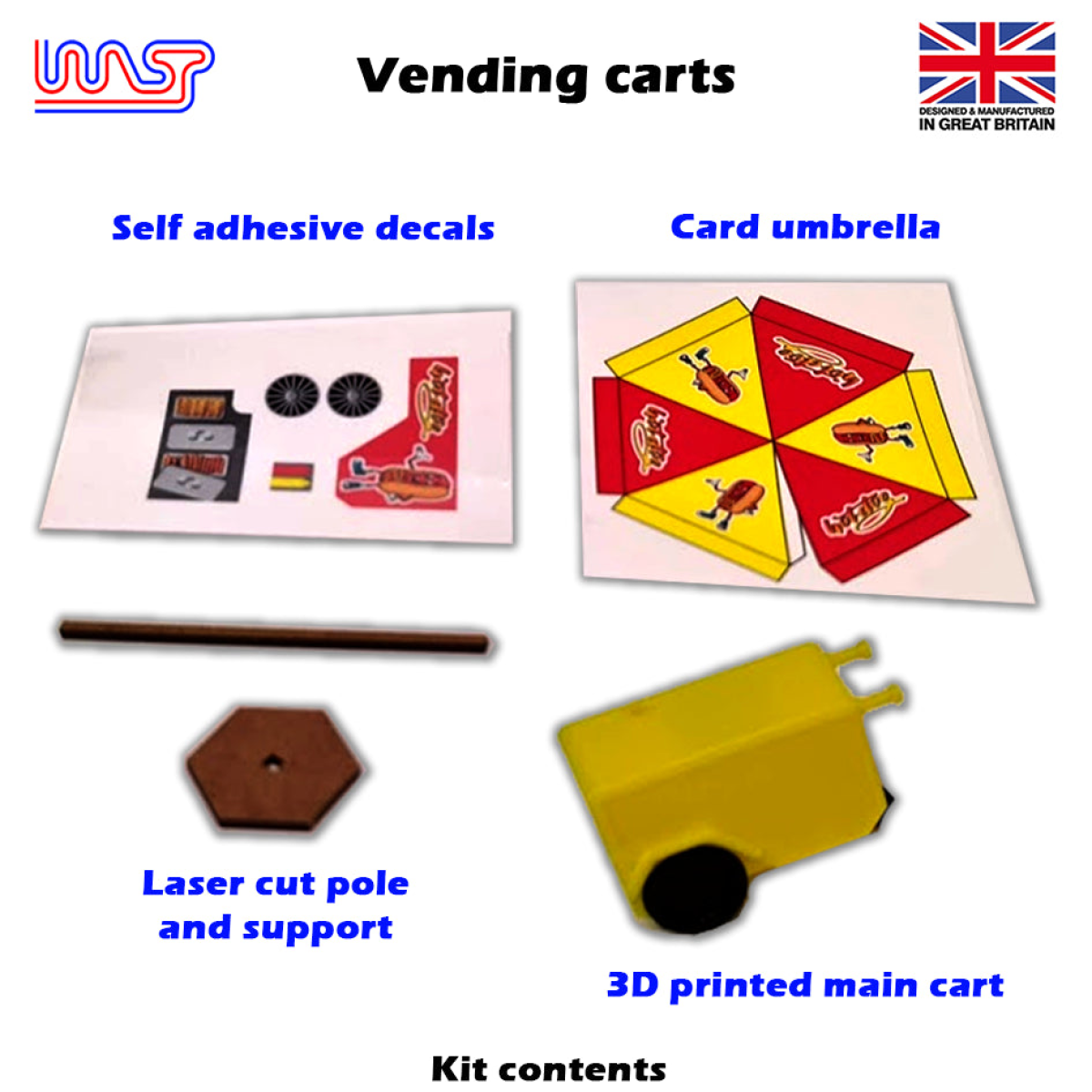 3D printed cart in the base colour shown with black wheels. Kit contains: 1 x 3D printed cart with wheels' 1 x Decal sheet printed on self adhesive paper and laminated to be cut out & stuck in place. 1 x Umbrella, printed on card. 1 x Support plate and pole laser cut from MDF Colours may vary slightly between plastic batches. Only 1 kit is included figures and other accessories and Figure in the picture are NOT included Safety Safety - Please note items are intended for decoration purposes only, they are not a toy and should not be used by children under 12 years. They could be a choking hazard if swallowed