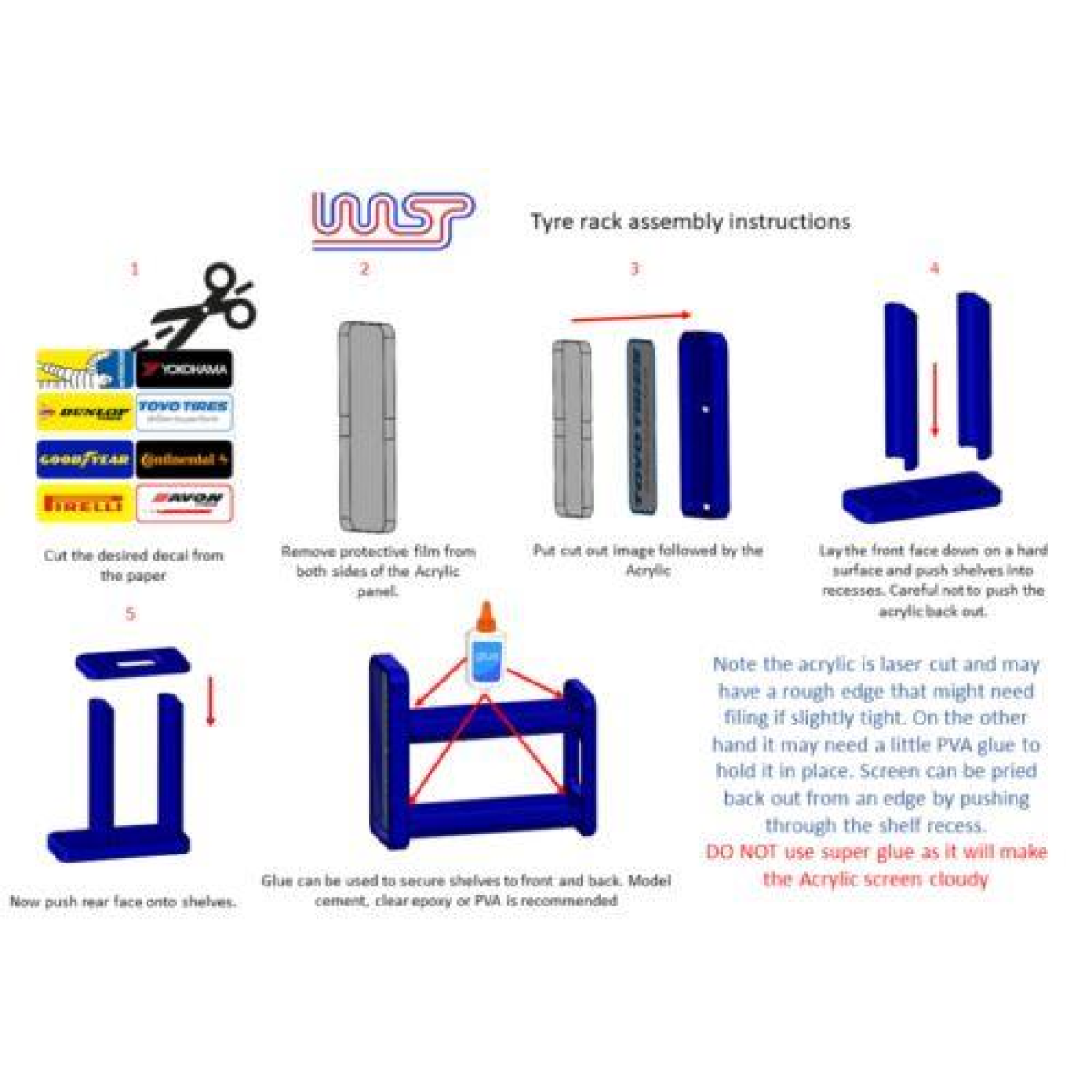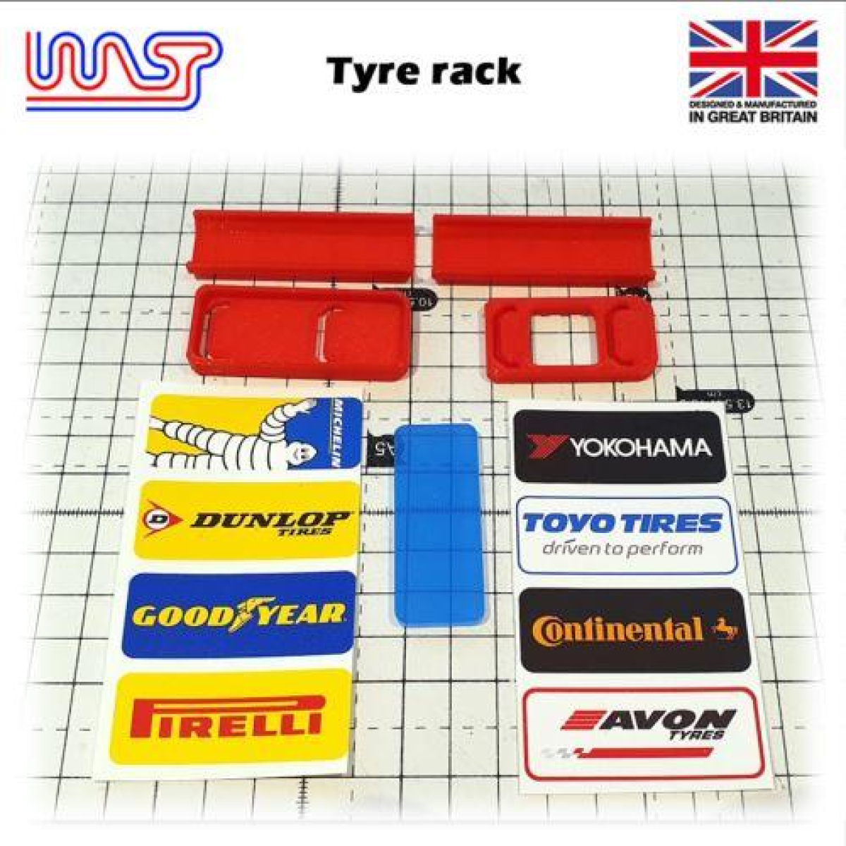 3D printed in the colour shown and supplied as a kit to assemble with decal sheet (with 8 logos) to go under the 3mm Acrylic front cover which pushes in place. See instructions for details Safety - Please note these are intended for decoration purposes only, they are not a toy and should not be used by children under 12 years. They could be a choking hazard if swallowed Only tyre rack is included, figures and other accessories in the picture are for illustration only