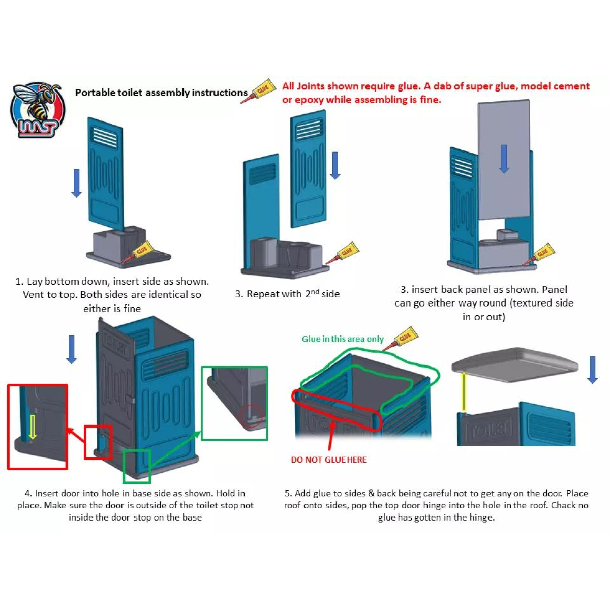 WASP 3D printed Portable toilet 1:32 scale (New design with opening door and internal details) 3D printed in the colour shown and supplied as a kit to assemble, must be glued together see assembly instructions image for details Only 1 toilet supplied as a kit, other items pictures for illustration only. Please note these are intended for decoration purposes only, they are not a toy and should not be used by children under 12 years. They could be a choking hazard if swallowed