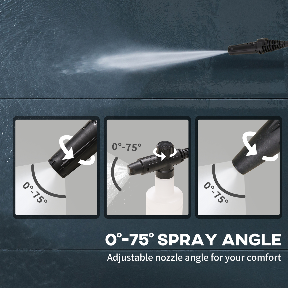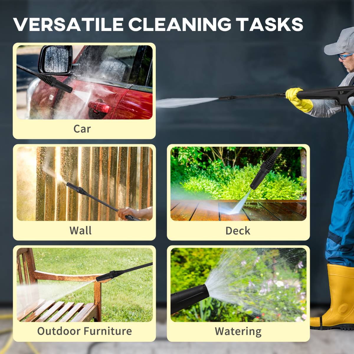 Multiple cleaning tasks: The jet washer can support a rated pressure of 100 bar and a max. pressure of 150 bar thanks to the 1800W powerful motor, and can effectively deal with various of dirt from dust to stubborn stains. Vehicles, outer walls, deck floors, outdoor furniture, garden fences, and more - all of them can acquire a completely new outlook.Adjustable nozzle angle: Adjust the spray angle as needed from 0e to 75e to keep your hand in a comfortable position.Automatic start & stop: When the trigger is pulled, the pump operates automatically