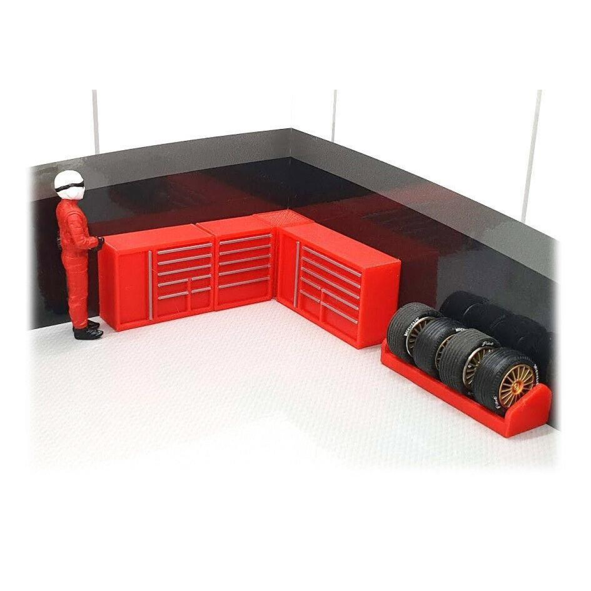 3D printed in the base colour shown with handles accented in second printed colour , Set consists of the following parts: Width x Height x Depth 1600mm tool chest - 50mm x 30mm x 16mm 1200mm tool chest - 38mm x 30mm x 16mm 800mm tool chest - 25mm x 30mm x 16mm Corner unit - 18mm x 30mm x 18mm Tyre/wheel rack - 55mm x 14mm x 17mm The boxes are designed and manufactured, they are 3D printed and therefore will not be perfect (the pictures are of actual printed parts and layer lines can be seen) Colours may vary slightly between plastic batches. Only boxes and rack are included figures and other accessories in the picture are for illustration only We also stock, Blue, Black, Grey, White, Green and Yellow sets
