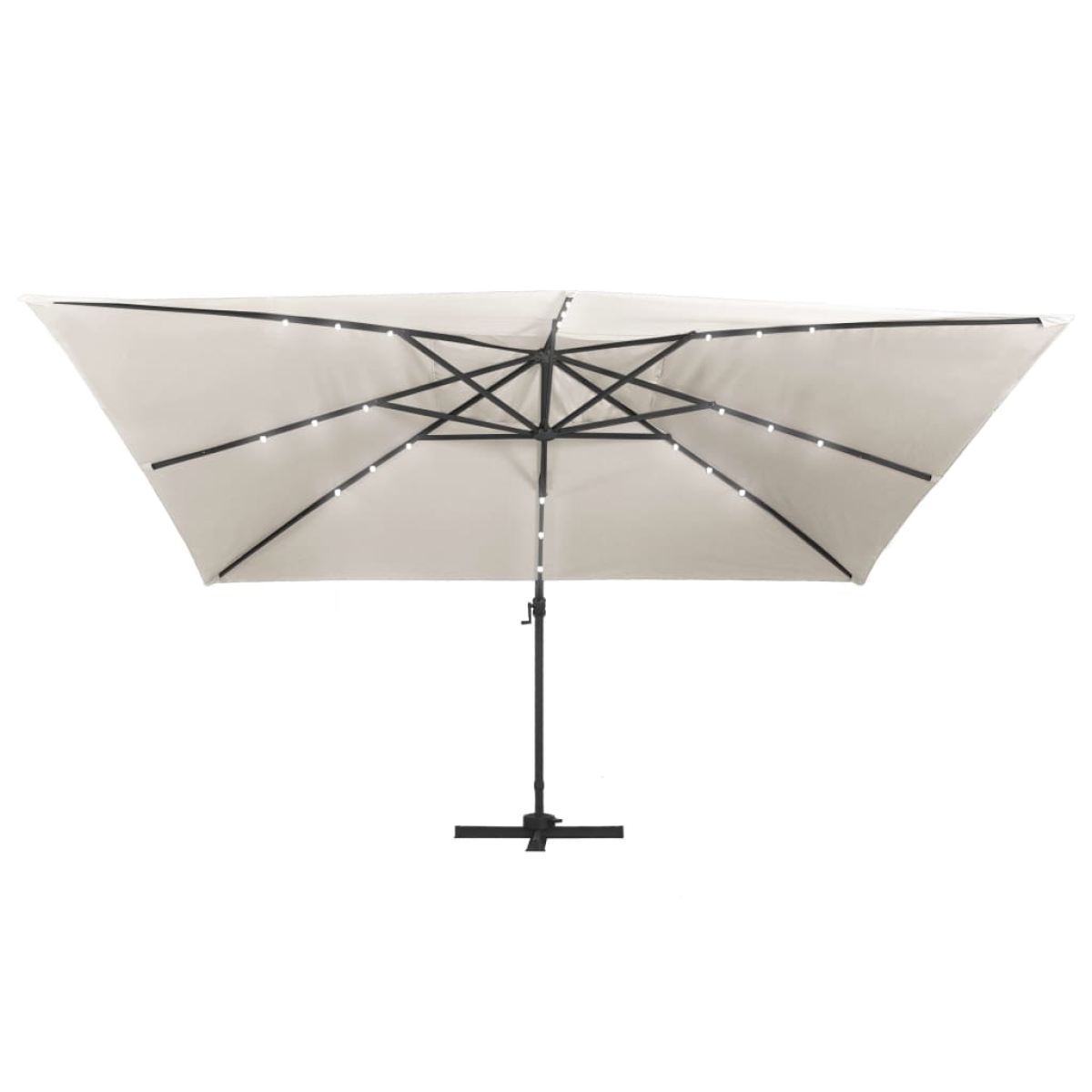 This elegant hanging parasol is perfect to create some shade and protect you from the sun's harmful UV rays. Made of UV protective and anti-fade polyester, the parasol cover provides you with optimum protection against the sun and is easy to clean. It features 24 solar-powered LEDs to automatically illuminate your outdoor living space and create a cosy and romantic ambience when the sun goes down. It comes with a sturdy cross base to add stability. Our garden umbrella can be easily opened and closed by simply turning the knob on the pole. The angle of the cover can be adjusted by pushing and pulling the handle up and down. The centre pole can also be rotated in 360 degrees by means of the pedal. The strong powder-coated aluminium pole, along with the 8 durable ribs, makes this parasol very stable and durable. The item is easy to assemble. Please note that we recommend treating the umbrella fabric with a waterproofing spray if it is subjected to heavy rainfall. Note: The product has a USB connector, but the certified 5V USB power source is not included.