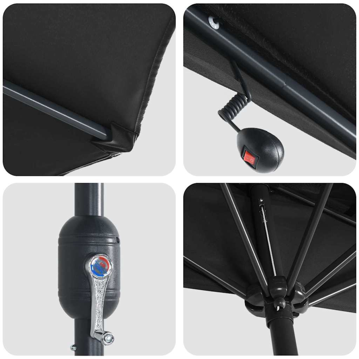 This modern garden parasol brings shade and light for your outdoor chill time. Perfect for balconies, gardens, or terraces, its snazzy design fits right in while keeping you sheltered from the sun. It creates a lovely vibe, great for both daytime and nighttime gatherings. With LED lighting for fun after dark, this parasol combines style and practicality, inviting you to enjoy your outdoor spaces longer. Materials: Made with high-quality polyester, this garden parasol is brilliant at blocking UV rays, so you’re sorted against the sun. The aluminium frame gives it strength and stability, looking sleek while fitting in beautifully with modern settings. Its smooth feel and water-resistant fabric add a practical touch. Included Components: With smart LED lights on the underside for those cosy evenings, the parasol gives off a warm glow. The hand crank makes it super easy to put up and take down, so you’ve got flexibility whenever you need it. These features make it not just pretty but really practical for your outdoor setup. Features: This parasol is collapsible, so you can easily fold it away for storage, perfect for seasonal use or when you just don’t need it. The water-resistant materials ensure it lasts longer, and the hand crank makes it easy to adjust. It’s great for changing outdoor spaces, catering to all sorts of needs and wants. Recommended Uses: Designed for summer fun, this parasol shines in gardens, terraces, and balconies, turning any spot into a chill-out zone. It fits right in with dining areas or social hangouts, making it great for get-togethers or lazy afternoons. Its versatile style suits all sorts of outdoor vibes. Care & Maintenance: To keep it looking its best, use a cover when it’s not in action to protect it from the elements. A quick spray with waterproof treatment now and then keeps it in good shape. Avoid harsh chemicals when cleaning, so your parasol stays a chic addition to your garden over time with minimal fuss.