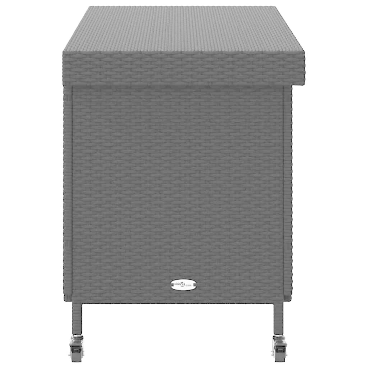 This garden storage box is ideal for storing your cushions, pillows, blankets, and other items in the garden or on the patio. Durable material: PE rattan, also known as poly rattan, is a strong, low-maintenance synthetic material that looks like natural rattan. It's lightweight, easy to clean, and commonly used for outdoor furniture due to its durability and weather-resistant properties.Storage function: The garden furniture features storage space underneath, equipped with a water-resistant bag for storing cushions, toys, and other items. The inner bag can be securely attached to the seat with hook-and-loop fasteners, ensuring stability and preventing movement.Safe and easy to open and close: The gas spring makes it easy to open the lid and keeps it from slamming shut or trapping fingers.Easy to move: This outdoor storage box features two wheels with brakes, allowing for effortless relocation to any desired location while securely locking in place for improved control and safety. Additionally, the handle facilitates easy transportation.Robust and stable frame: The powder-coated steel frame ensures that the garden furniture is strong and stable for daily outdoor use. Good to know:To make sure your outdoor furniture stays beautiful, we recommend protecting it with a waterproof cover.