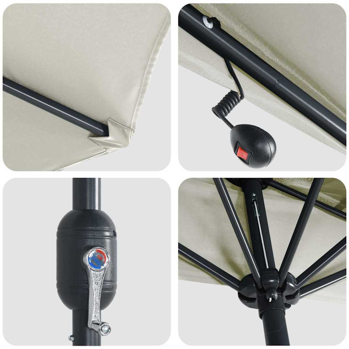 This Modern Garden Parasol is a great mix of style and function, perfect for your outdoor space. With its simplicity and modern vibe, this parasol elevates any garden or patio. It gives you loads of shade and fits right in with different outdoor styles to create a chic and welcoming scene. Sturdy Fabric: The fabric of the parasol looks smart and stands up to the weather. It's top quality, so it won't fade or tear easily, making it a good choice for both looks and long-lasting use. LED Lights: Fitted with handy LED strip lights, this parasol brightens up your outdoor events at night. The solar-powered LEDs are eco-friendly and give off a soft glow, which is perfect for those evening hangs outside. UV Protection: Made with UV-resistant materials, this parasol can handle the sun's harsh rays without falling apart. You can enjoy the outdoors while staying safe from harmful UV rays, making your relaxation in the sun much better. Easy to Assemble: Designed for convenience, you can put this up with just one person. It sets up quickly, so you can spend more time enjoying your lovely outdoor spot. Low Maintenance: Ideal for outdoor areas like gardens or terraces. Its strong build and low maintenance mean it's great for all sorts of outdoor uses, making it a solid choice for seasonal enjoyment.