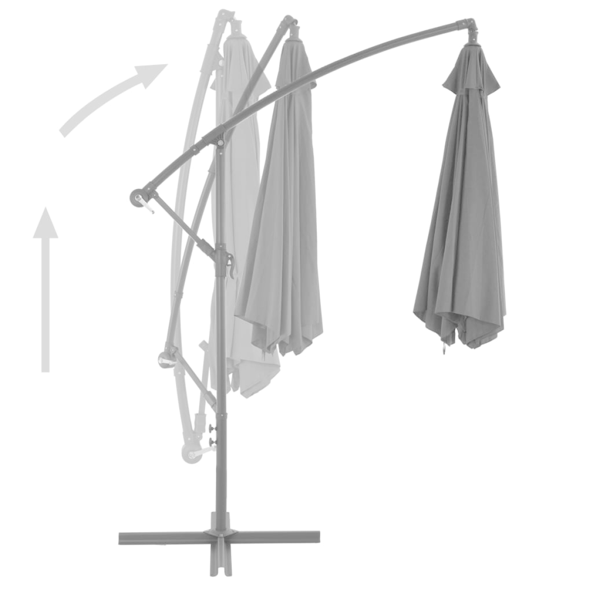 This elegant hanging parasol is perfect to create some shade and protect you from the sun's harmful UV rays. Made of UV protective and anti-fade polyester, the parasol cover provides you with optimum protection against the sun and is easy to clean. It features a sturdy cross base to add stability. The exclusive design of this parasol allows you to tilt the parasol to block the sun as it heads down towards the horizon. The strong metal pole, along with the 6 durable ribs, makes the parasol very stable and durable. Our garden umbrella can be easily opened and closed thanks to the crank mechanism. The item is easy to assemble. Please note that we recommend treating the umbrella fabric with a waterproofing spray if it is subjected to heavy rainfall.