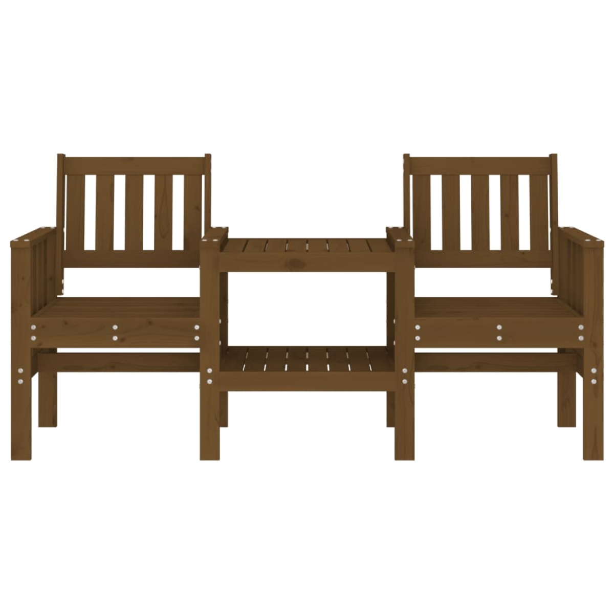 Enjoy romantic evenings on the garden bench with an integrated tea table for wine glasses, snacks or coffee. Solid pine wood: The garden bench with table is made of solid pine wood for sturdiness and stability. Solid pine wood is a beautiful natural material. Pine wood has a straight grain, and the knots give the material its signature, rustic look.Comfortable seating experience: Featuring armrests and a backrest, the outdoor bench with table gives you the utmost comfort.Practical integrated table: The integrated table and lower shelf between the two seats are ideal for storing drinks, snacks, magazines and other items you want to keep within reach.Slatted design: The slatted design of the outdoor bench prevents water accumulation, keeping the seat dry and preventing unnecessary rotting. Good to know:To make sure your outdoor furniture stays beautiful, we recommend protecting it with a waterproof cover.