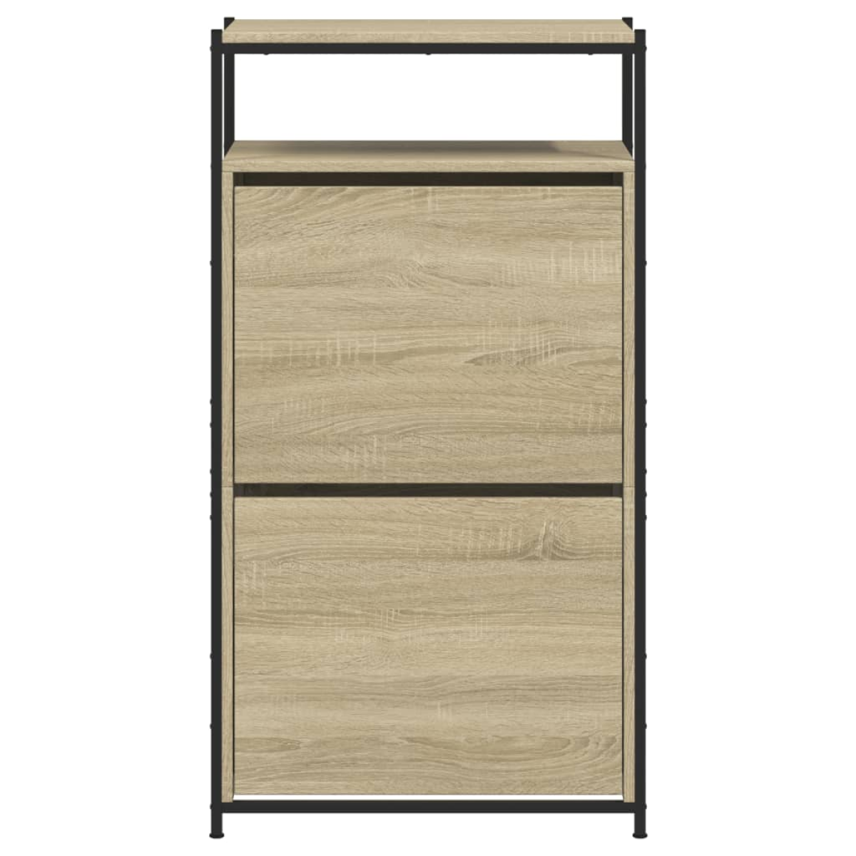 This shoe cabinet is an excellent choice to store your shoes in an organised way, especially for tight and narrow spaces thanks to its compact design. Durable material: The engineered wood is of exceptional quality with a smooth surface and also features strength, stability, and resistance to moisture.Ample storage space: This shoe rack features 1 shelf and 2 flip drawers, providing ample space to keep your shoes within reach and well organised.Practical top: The sturdy top of the shoe cupboard is ideal for displaying decorative objects, photo frames, or potted plants.Space-saving design: The slim shoe storage cabinet is designed to perfectly fit small spaces like entryway, hallway, mudroom, etc. Warning:To prevent it from tipping over, this product must be used with the provided wall attachment device.