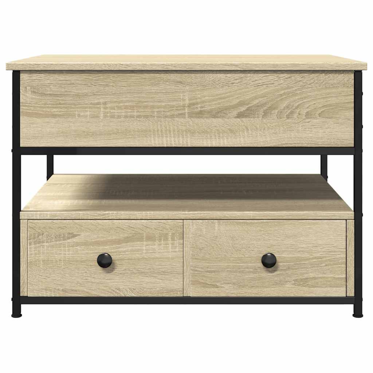 Add a touch of elegance to your living room with this stylish coffee table. Durable material: The engineered wood is of exceptional quality with smooth surface and also features strength, stability and resistance to moisture.Lift-top design: The tabletop of this sofa table can be smoothly lifted to a comfortable height, converting it to a spot where you can work or dine.Ample storage space: The living room table with 2 drawers has ample storage space beneath the top for a hidden compartment, so you can store your often-used items and keep them away from dust.Adjustable feet: The centre table is equipped with 4 adjustable feet that can protect your floor from scratches and keep it stable on the uneven floor.Sturdy frame: The metal frame of this couch table ensures sturdiness and stability.