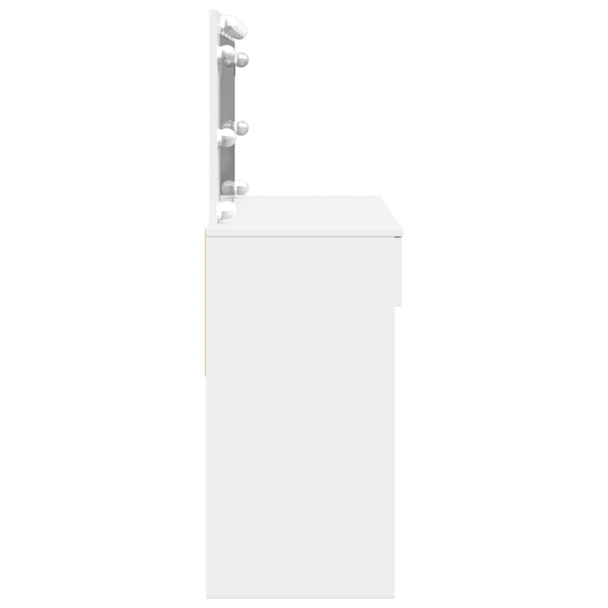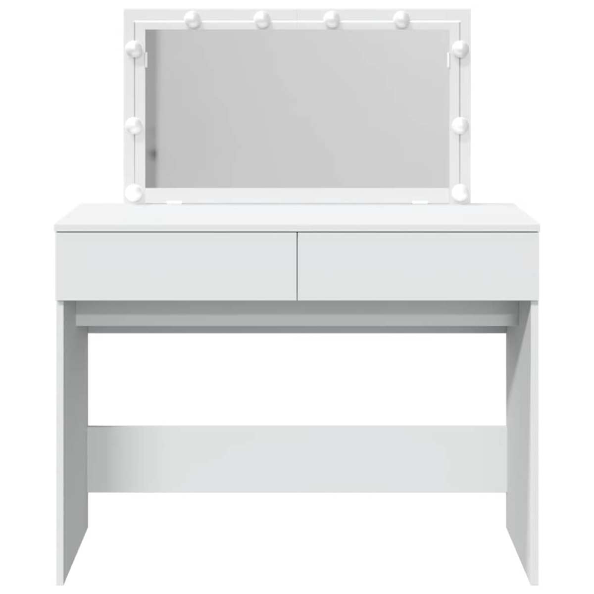The dressing table is a great addition to your bedroom decor while keeping your cosmetics close at hand! Stable and durable material: Engineered wood is a durable and stable material with a smooth surface that is resistant to moisture, warping, and splitting, making it a reliable choice for a variety of projects.Ample storage space: The makeup table with 2 drawers offers ample storage space for keeping your various daily essentials well organised and within easy reach.Utility mirror: A beautiful mirror provides the view for makeup application and adds an elegant touch to the vanity desk.LED light: The vanity table has LED bulbs with USB, which are easy to switch modes from warm to cold white. The featured LED bulbs around the mirror illuminate your beauty as well. Warning:To prevent it from tipping over, this product must be used with the provided wall attachment device.