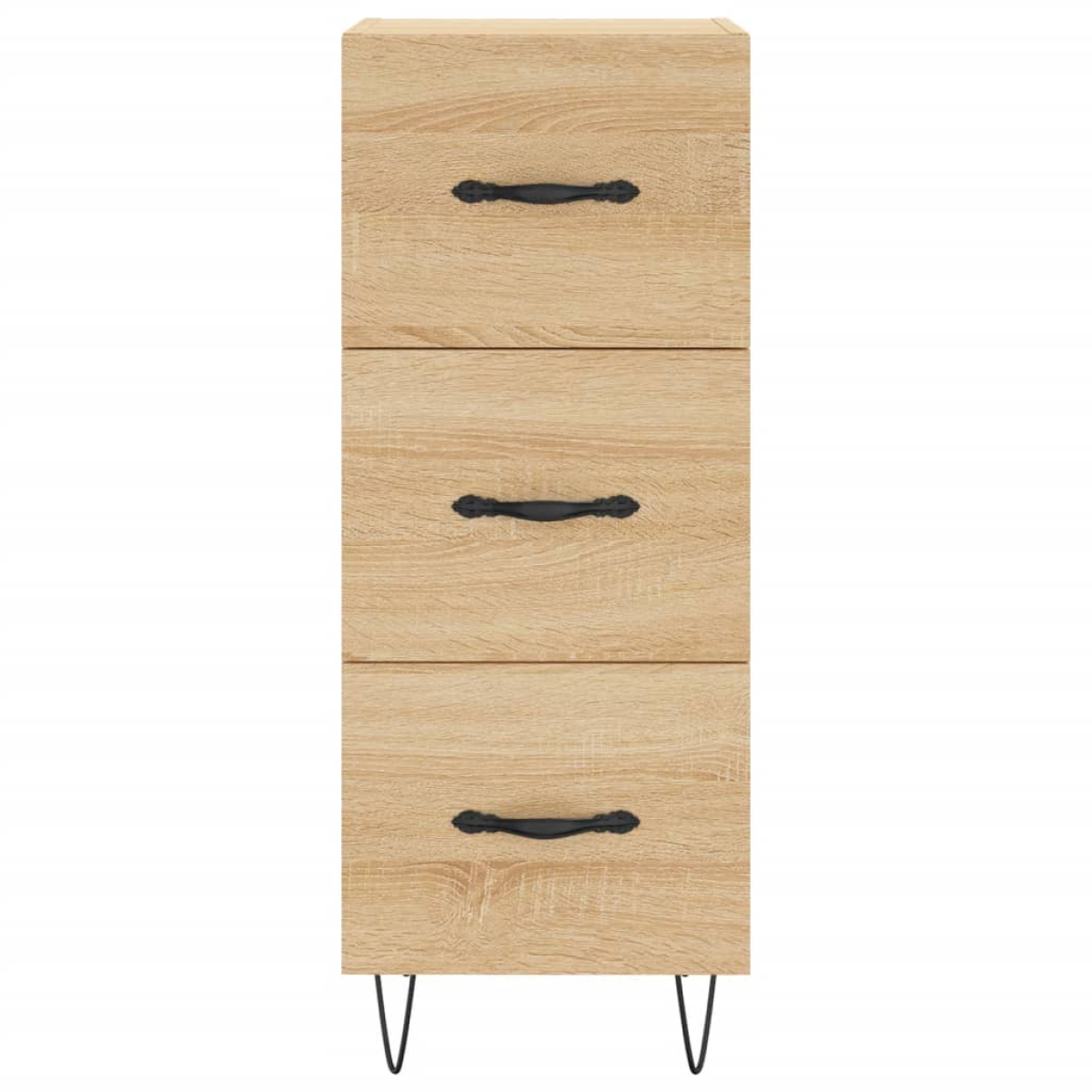 This modern sideboard, featuring a timeless look, is meant to be an excellent addition to your home. Durable material: The engineered wood is of exceptional quality with smooth surface and also features strength, stability and resistance to moisture. Metal legs: The metal legs add a modern and calm style to your interior while ensuring stability. Ample storage space: This sideboard cabinet is designed with 3 drawers to keep things organised and within easy reach. Stable and sturdy top: The top of the cupboard is perfect for displaying your decorative items, picture frames, and potted plants. Warning:To prevent it being overturned, this product must be used with the provided wall attachment device.