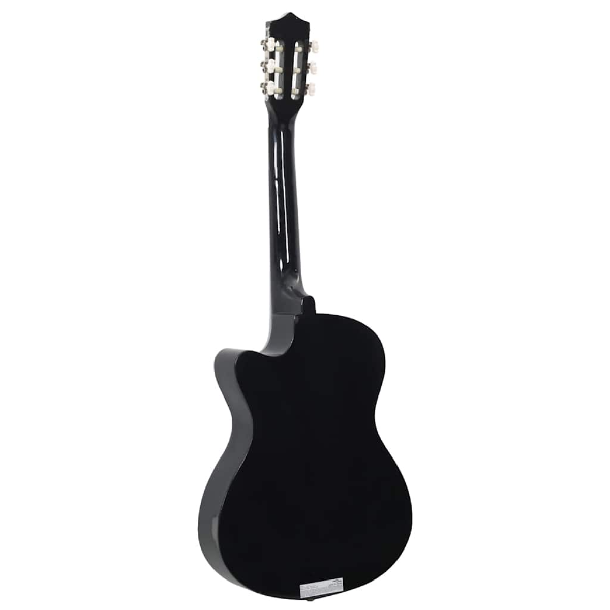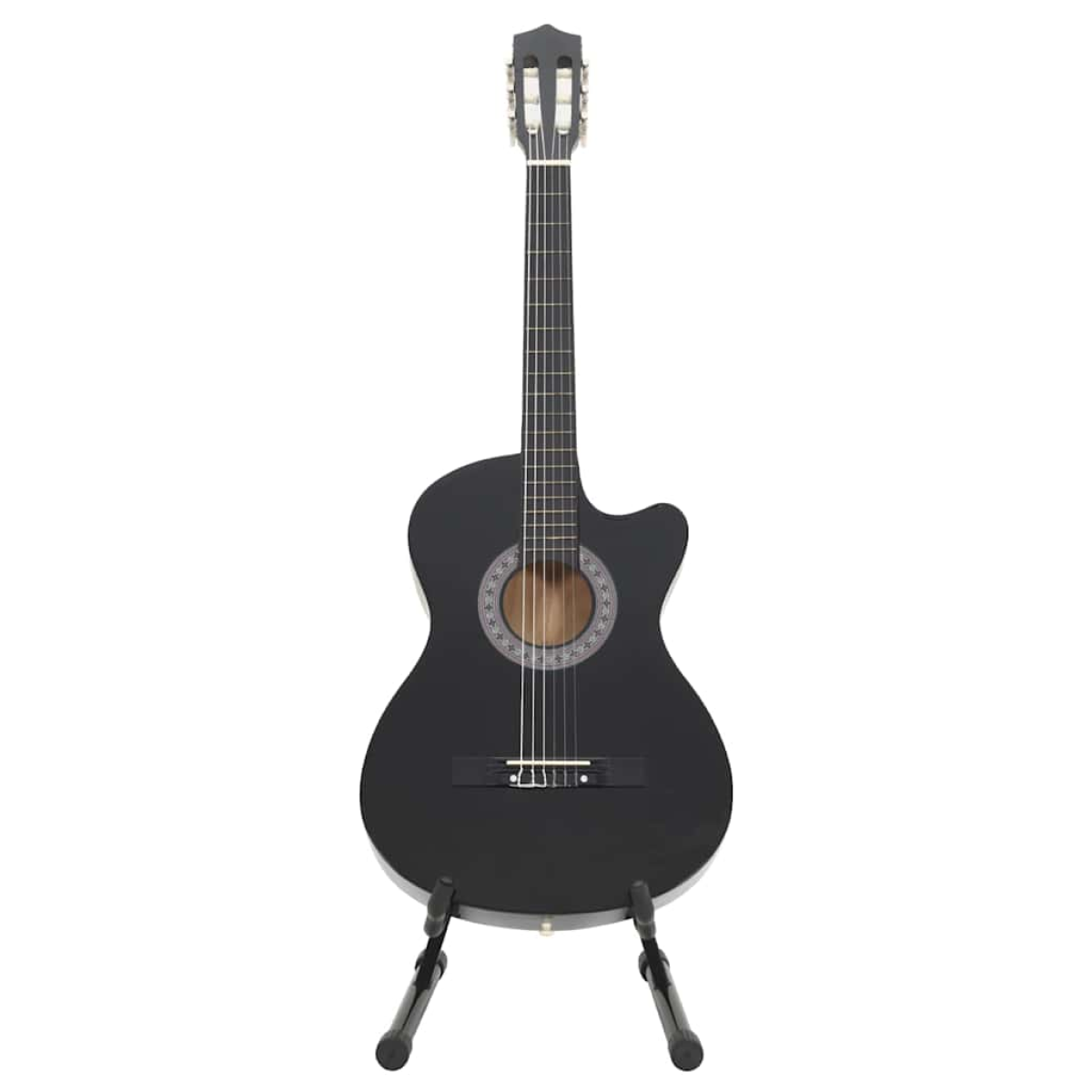 Our western cutaway guitar is a great instrument for beginners, amateurs and any level musicians. In addition to a guitar, the pack comes with a guitar bag, strap, picks, pick holder, guitar string set, string crank, capo, chromatic tuner and guitar holder. This guitar is made of solid basswood with 6 strings. The excellent sound quality and beautiful design make it very valuable. With a scale of 63 cm, this acoustic guitar has everything you need to become the next guitar player. The tuner can help tune the guitar strings better, while the capo can help to adjust the tone of the guitar. The 3 picks are used for plucking strings and can be put in the pick holder. It is usually a substitute for the fingers, but it can also be played with fingers together. The string crank, as a useful tool, makes the process of replacing strings easier. The included bag with a strap is perfect for traveling musicians and easy storage. Additionally, you can place your guitar in the guitar holder, which is very convenient. Our guitar set is easy to assemble.