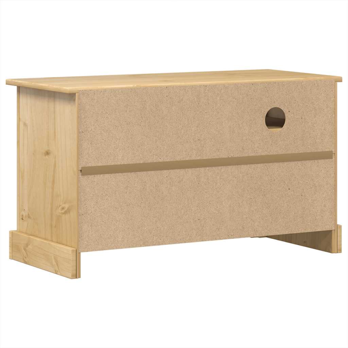 This wooden TV cabinet with ample storage space is a practical addition to your living room or bedroom. Solid pine wood: Solid pine wood is a beautiful natural material. Pine wood has a straight grain, and the knots give the material its signature, rustic look. Made of solid pine wood, the TV stand is durable and sturdy.Ample storage space: The TV stand features a drawer and 4 shelves, providing ample storage space for keeping your magazines, books, DVDs, and multimedia devices well-organised and within reach.Metal handles: The TV console comes with metal ring handles that make the drawers easy to open and close while also adding extra beauty.Easy to maintain: The TV stand cabinet is easy to clean with a damp cloth and requires less maintenance. Warning:To prevent it from tipping over, this product must be used with the provided wall attachment device.