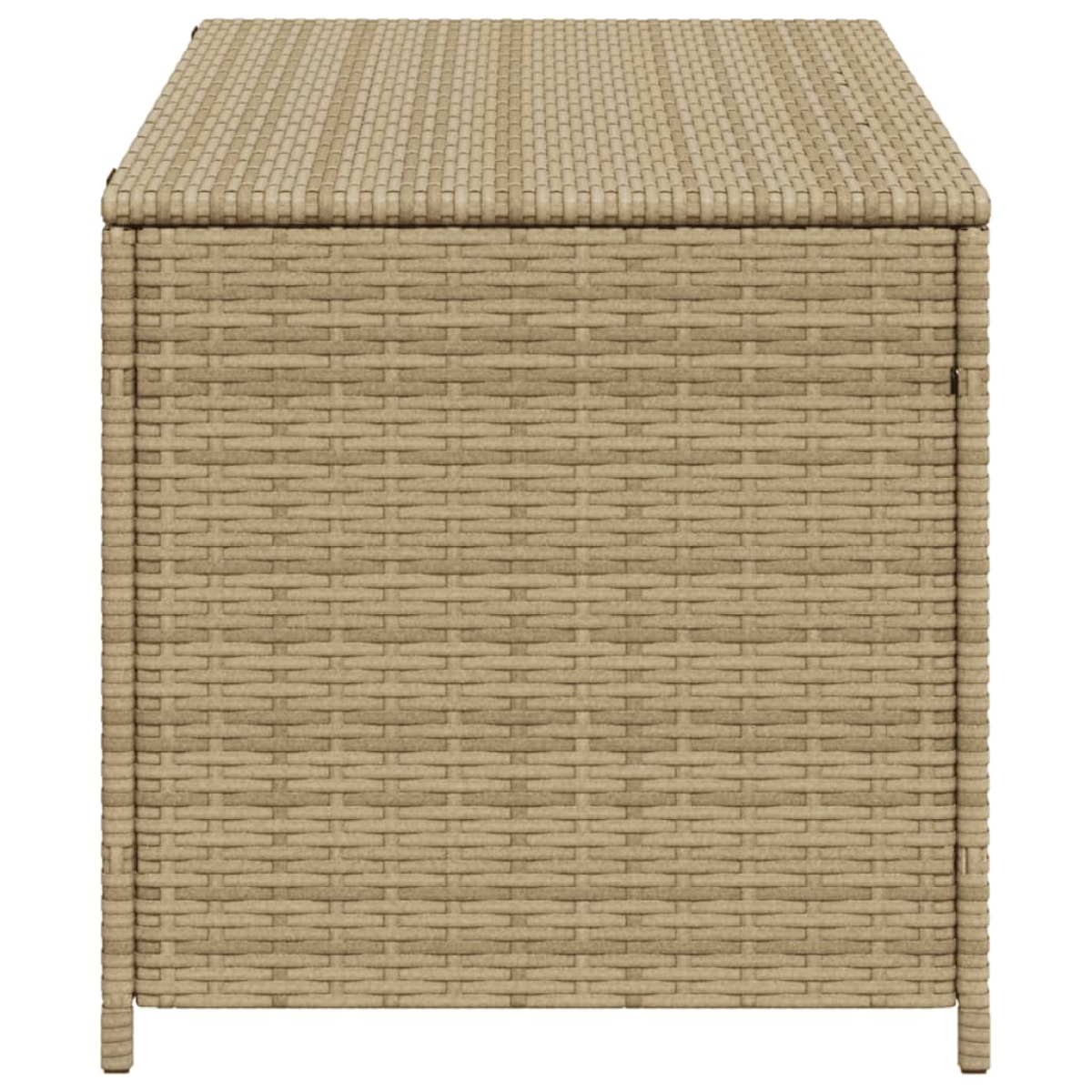 This garden storage box is ideal for storing your cushions, pillows, blankets, and other items in the garden or on the patio. Durable material: PE rattan, also known as poly rattan, is a strong, low-maintenance synthetic material that looks like natural rattan. It's lightweight, easy to clean, and commonly used for outdoor furniture due to its durability and weather-resistant properties.Storage function with water-resistant bag: The garden furniture features a water-resistant bag for storing cushions, and other items. The inner bag can be securely fastened to the outdoor furniture with hook-and-loop fasteners for added stability.Safe and easy to open and close: The gas spring makes it easy to open the lid and keeps it from slamming shut or trapping fingers.Robust and stable frame: The powder-coated steel frame ensures that the garden furniture is strong and stable for daily outdoor use. Good to know:To make sure your outdoor furniture stays beautiful, we recommend protecting it with a waterproof cover.